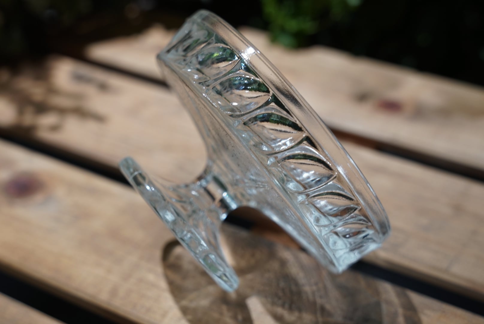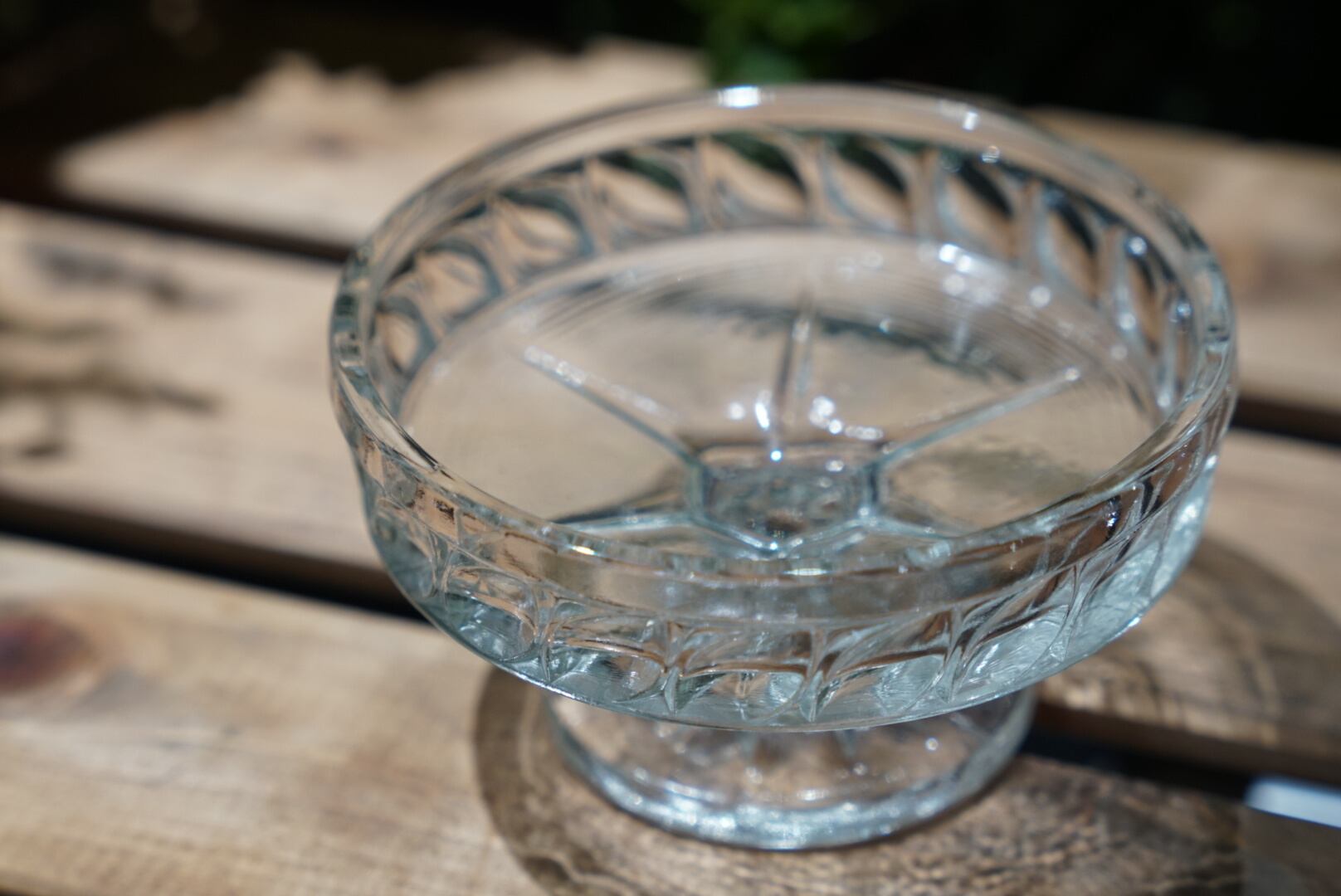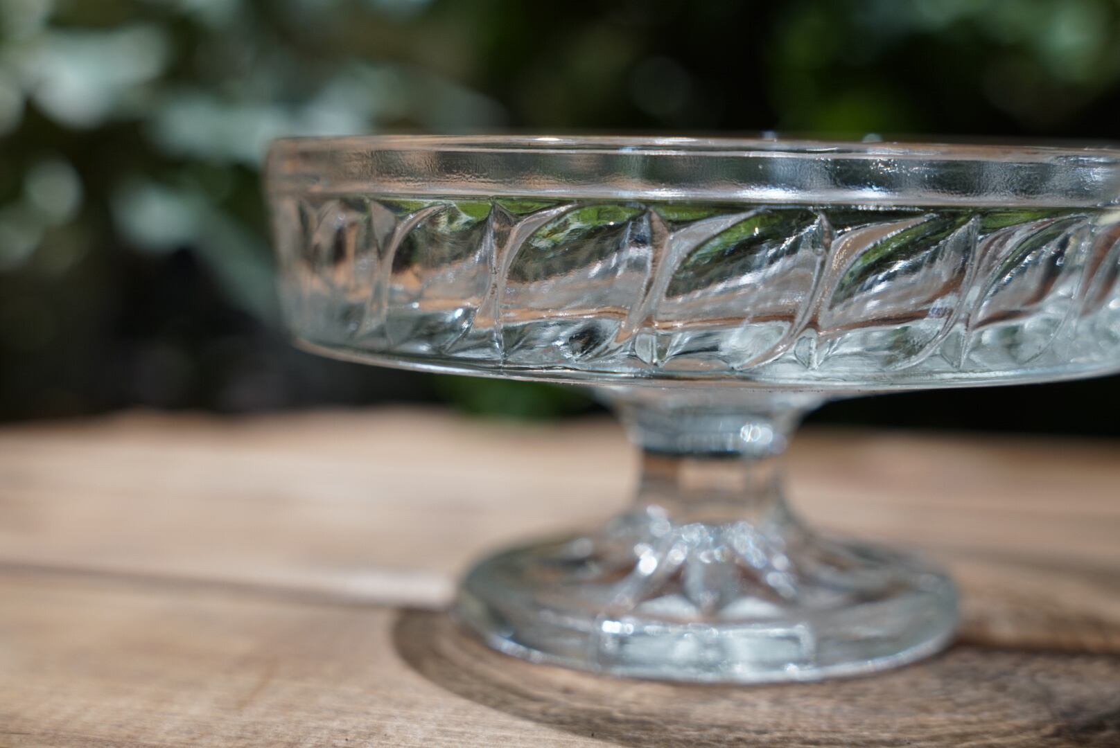 ぽってりと厚みのあるガラスに、優美なリーフ模様が刻まれたコンポート皿です。