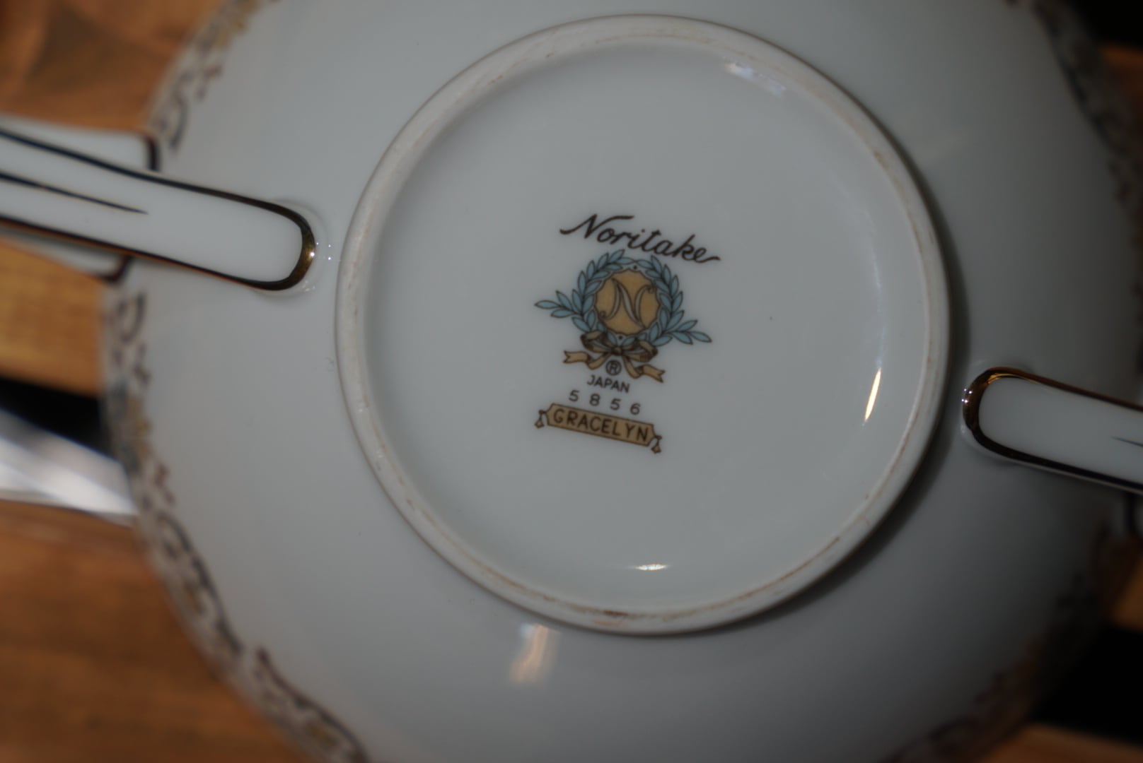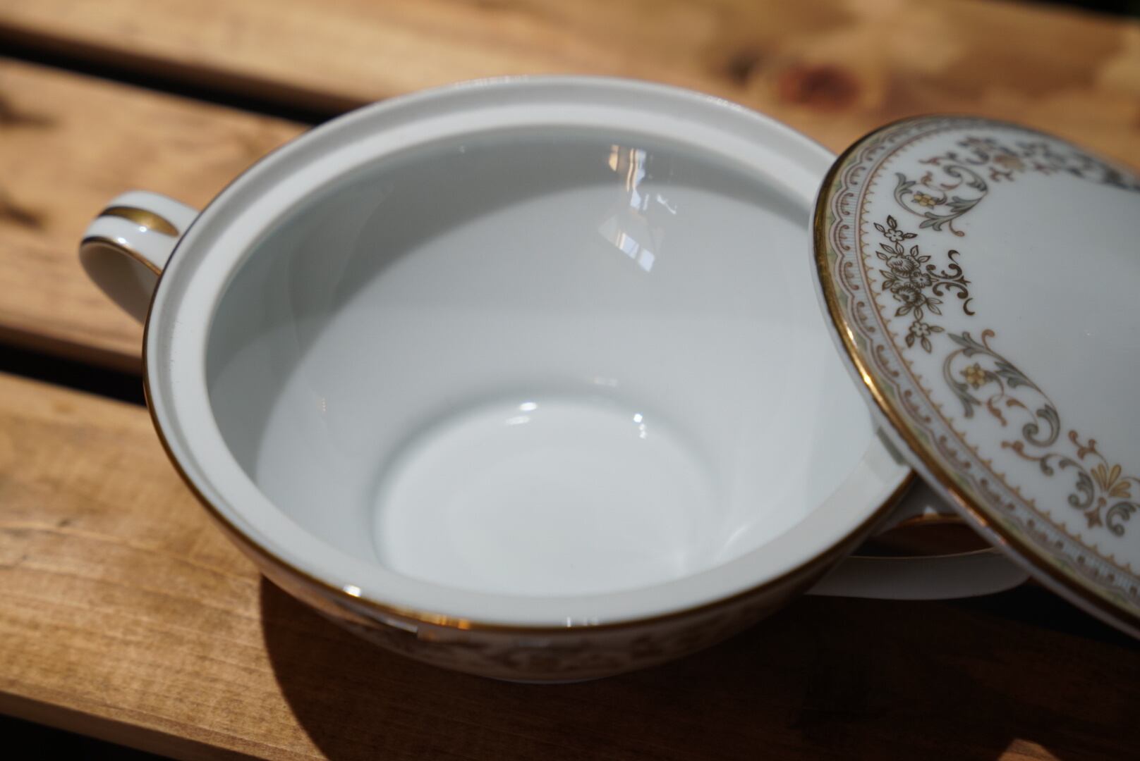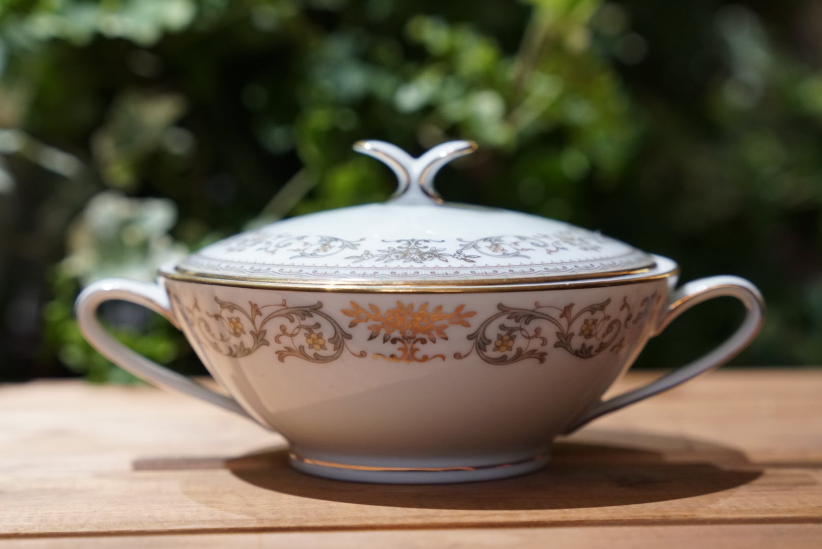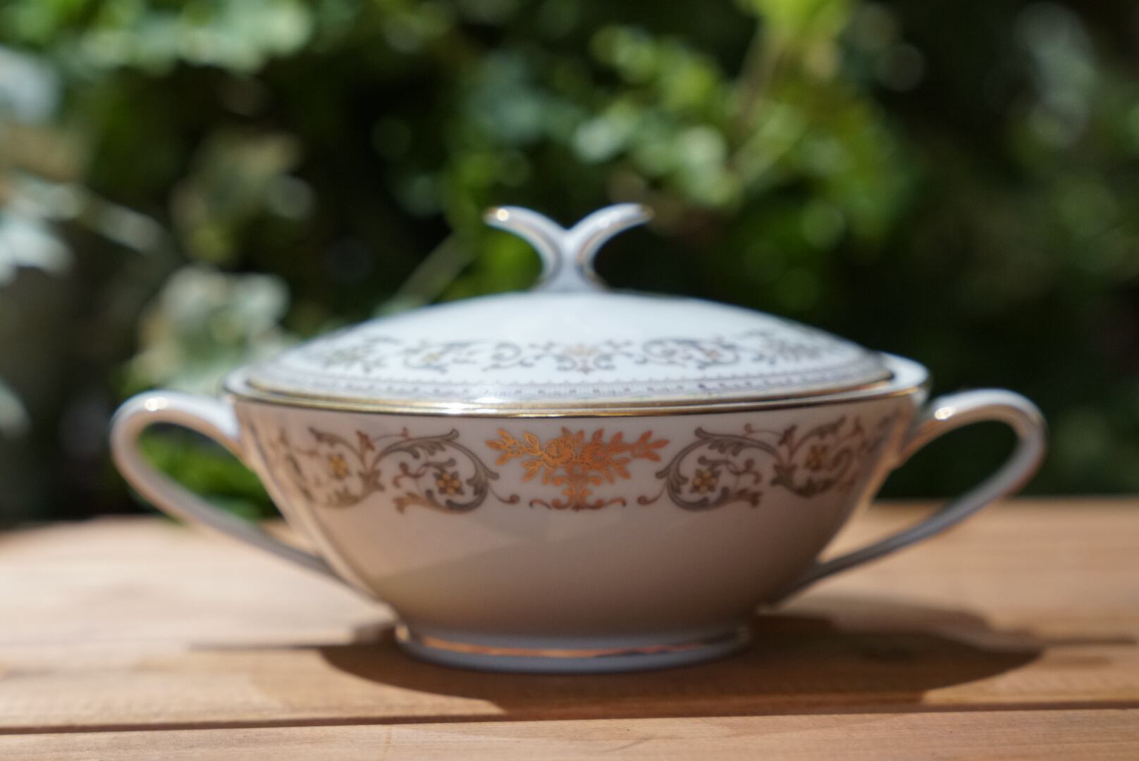 オールドノリタケならではの精緻な絵付けと、半世紀以上の時を経ても褪せない上品さは、まさに食卓の小さな宝物。両手付きのフォルムと可憐な蓋のつまみが、日常のティータイムを特別なひとときへと誘います。