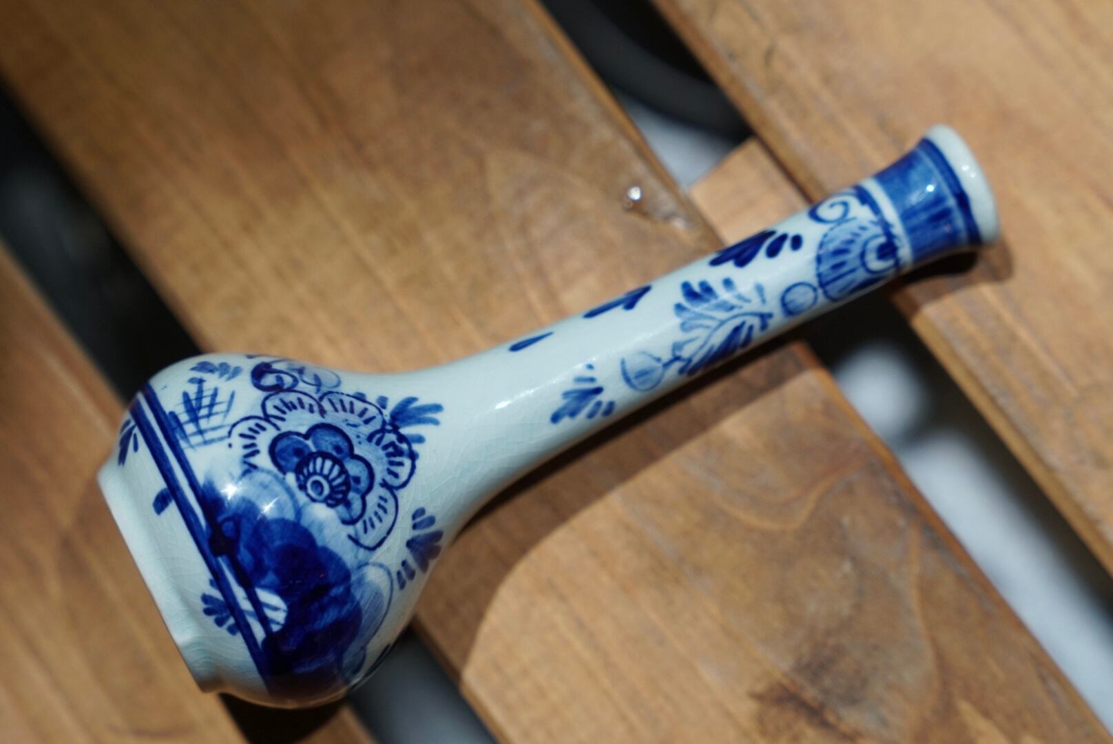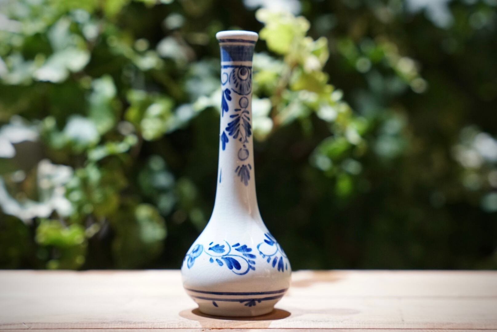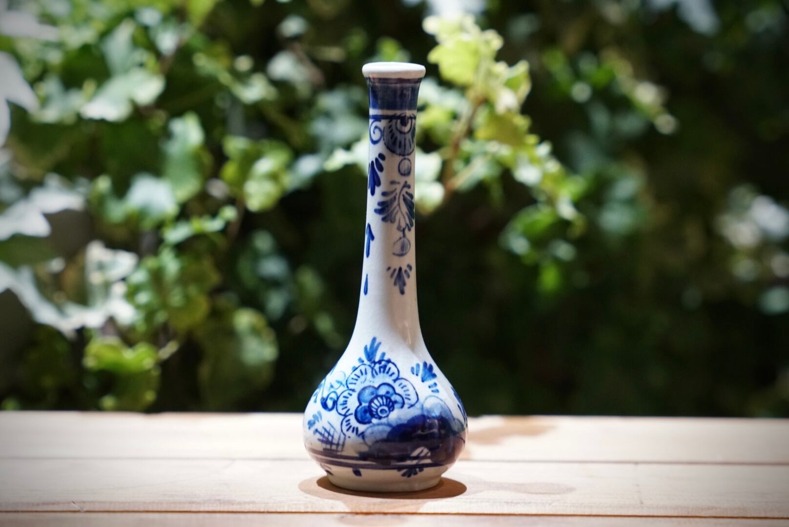 17世紀のオランダで生まれた「デルフト焼き」は、東洋磁器の白と藍に魅せられた職人たちの情熱から誕生しました。本品は、その伝統を受け継ぐ、小ぶりで愛らしい高さ約14cmの一輪挿しです。