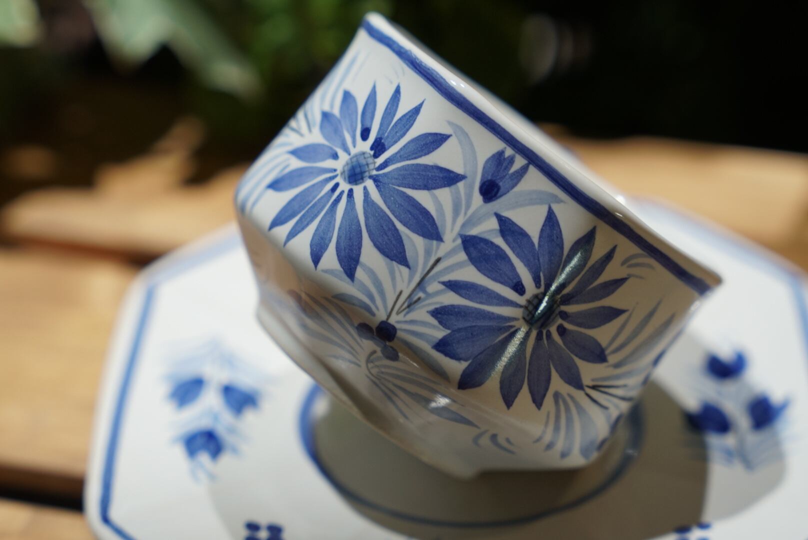 目に飛び込んでくるのは、大胆で生命力あふれる筆致で描かれた花模様。ぽってりとした厚さがそっと手に馴染み、少し珍しい八角形のソーサーは、テーブルの上に置くだけで、空間に心地よいリズムを生み出してくれるでしょう。