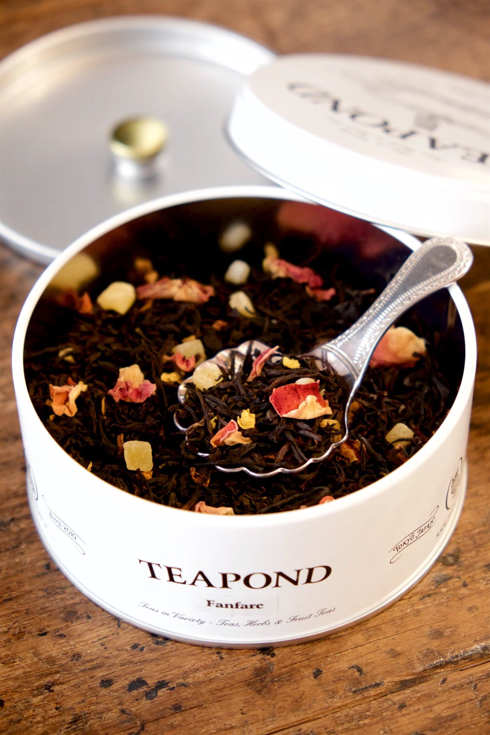 マンゴーやピーチなど数種類の果実と色鮮やかな花々が、ティーカップの中で甘い香りのファンファーレを奏でる華やかな銘柄です。茶葉にお湯を注ぐとティーポットの中でローズとヒマワリの花びらが紙吹雪のように舞い散り、香り、味わい、美しさすべてでティータイムを彩ります。暑い日々には、フルーティーな香りのアイスティーとしてもお楽しみください。