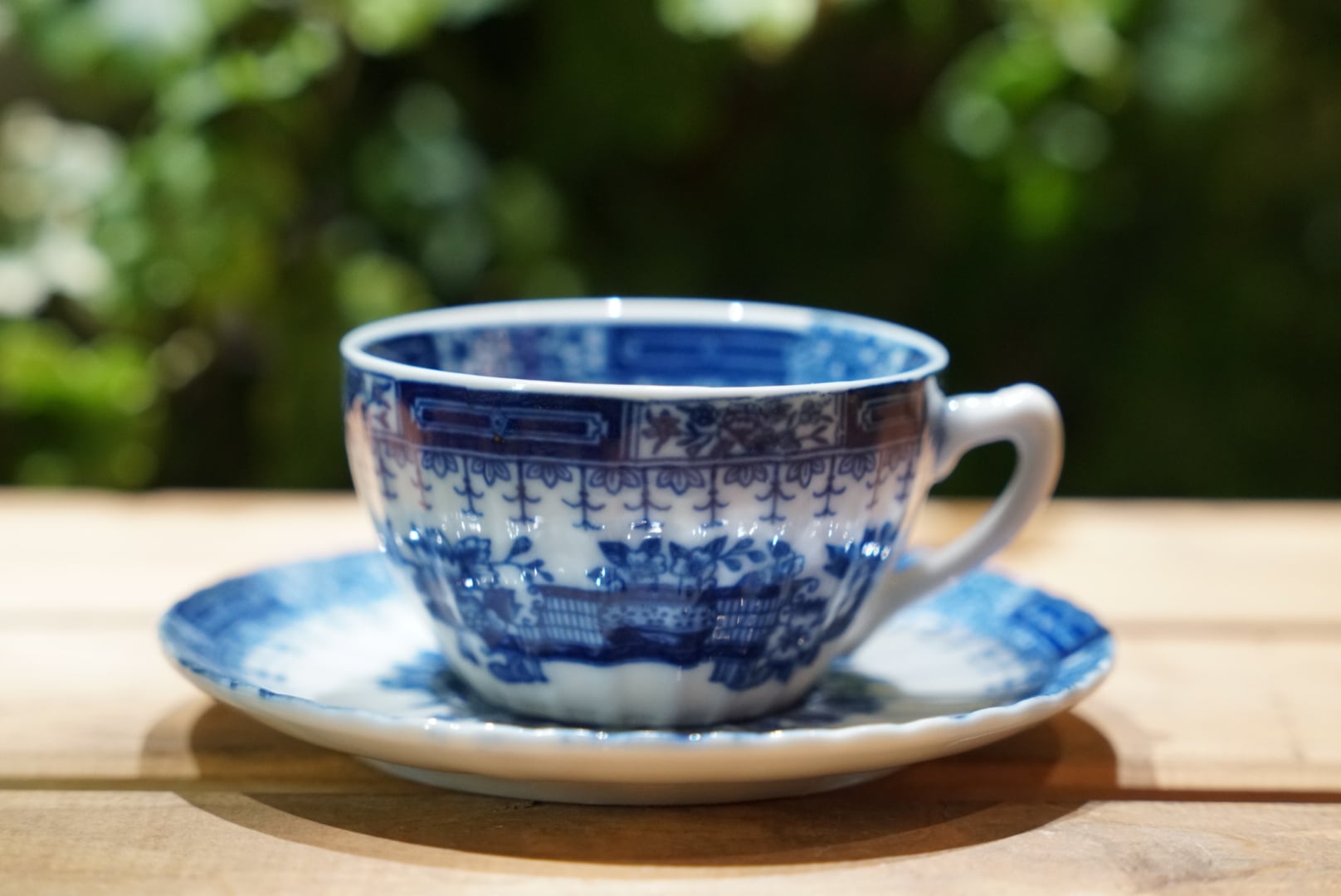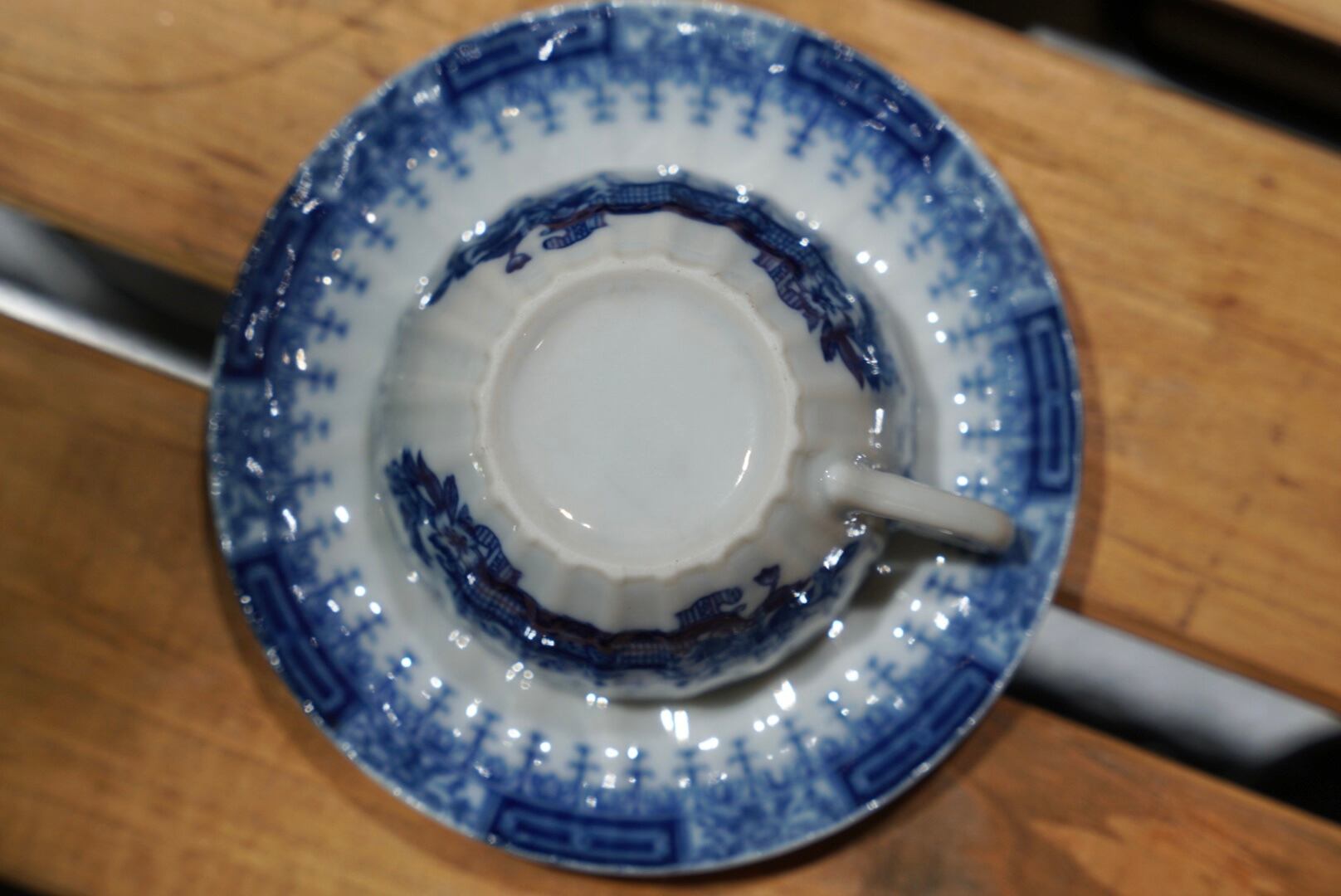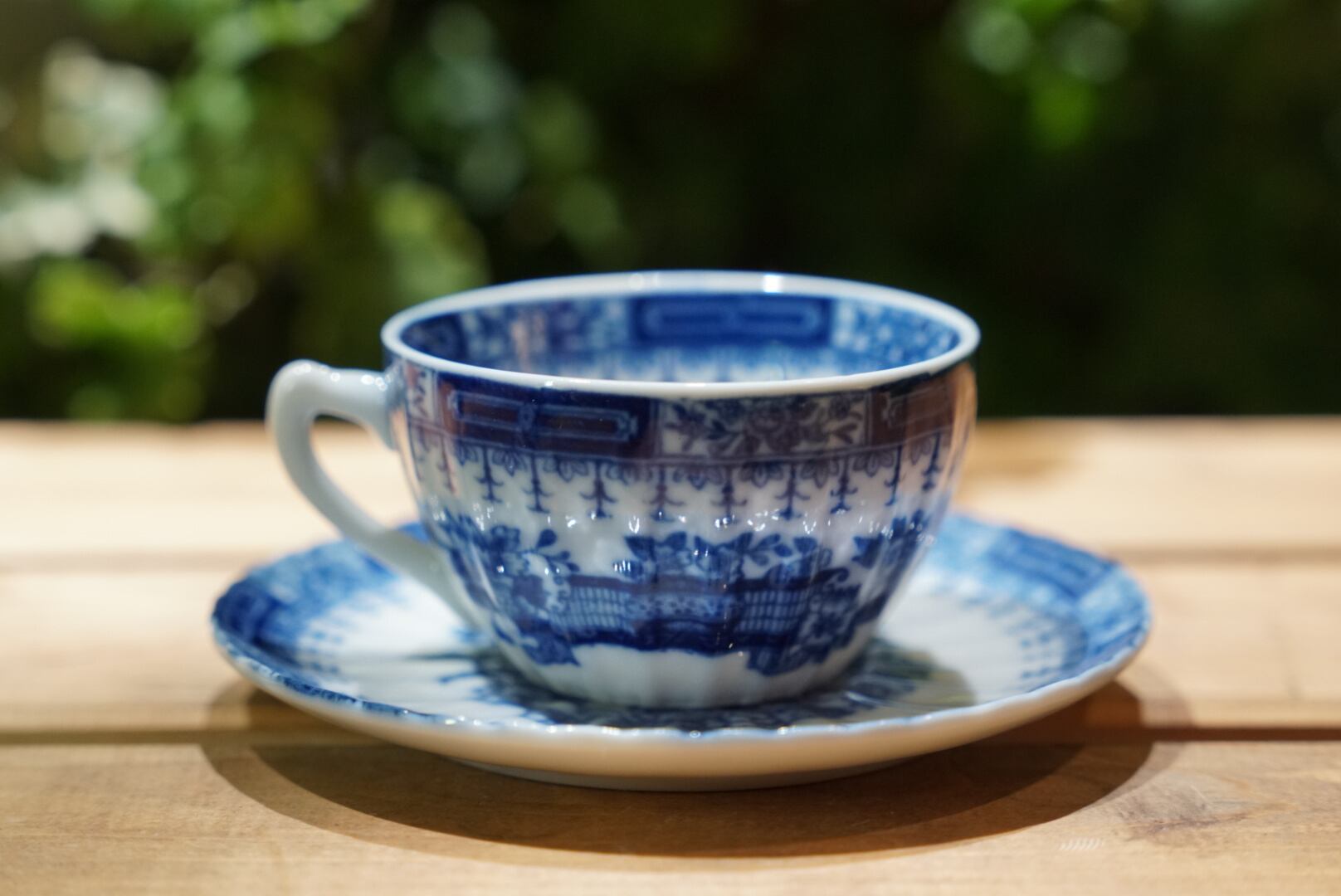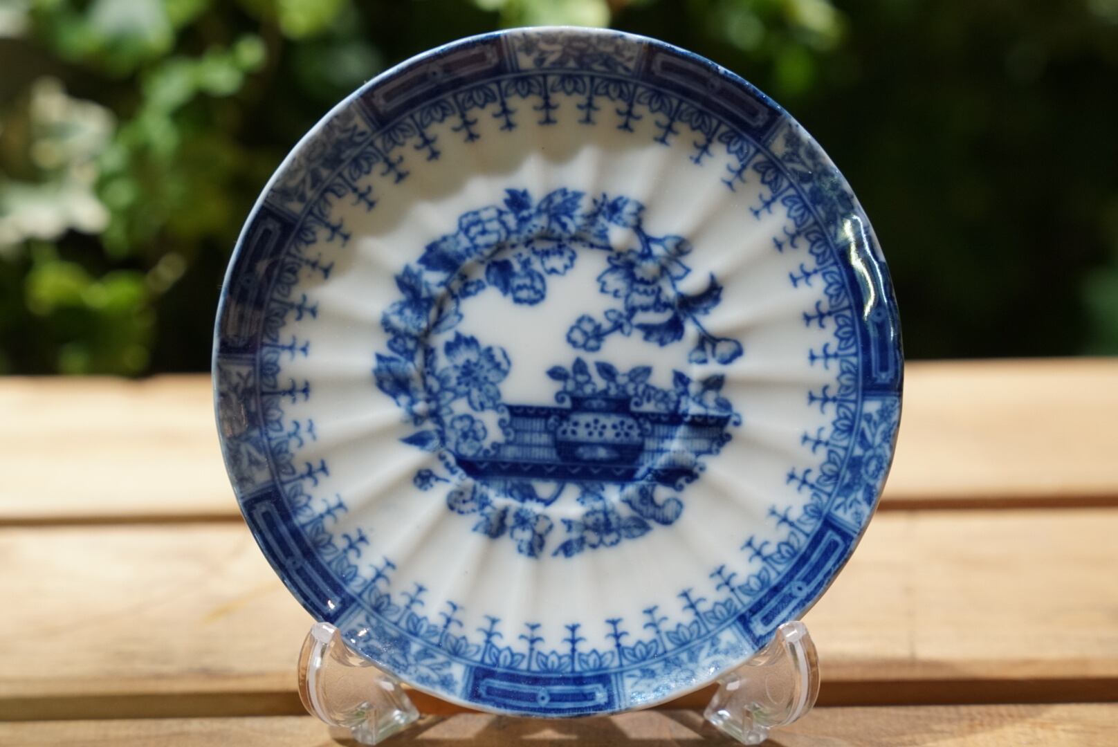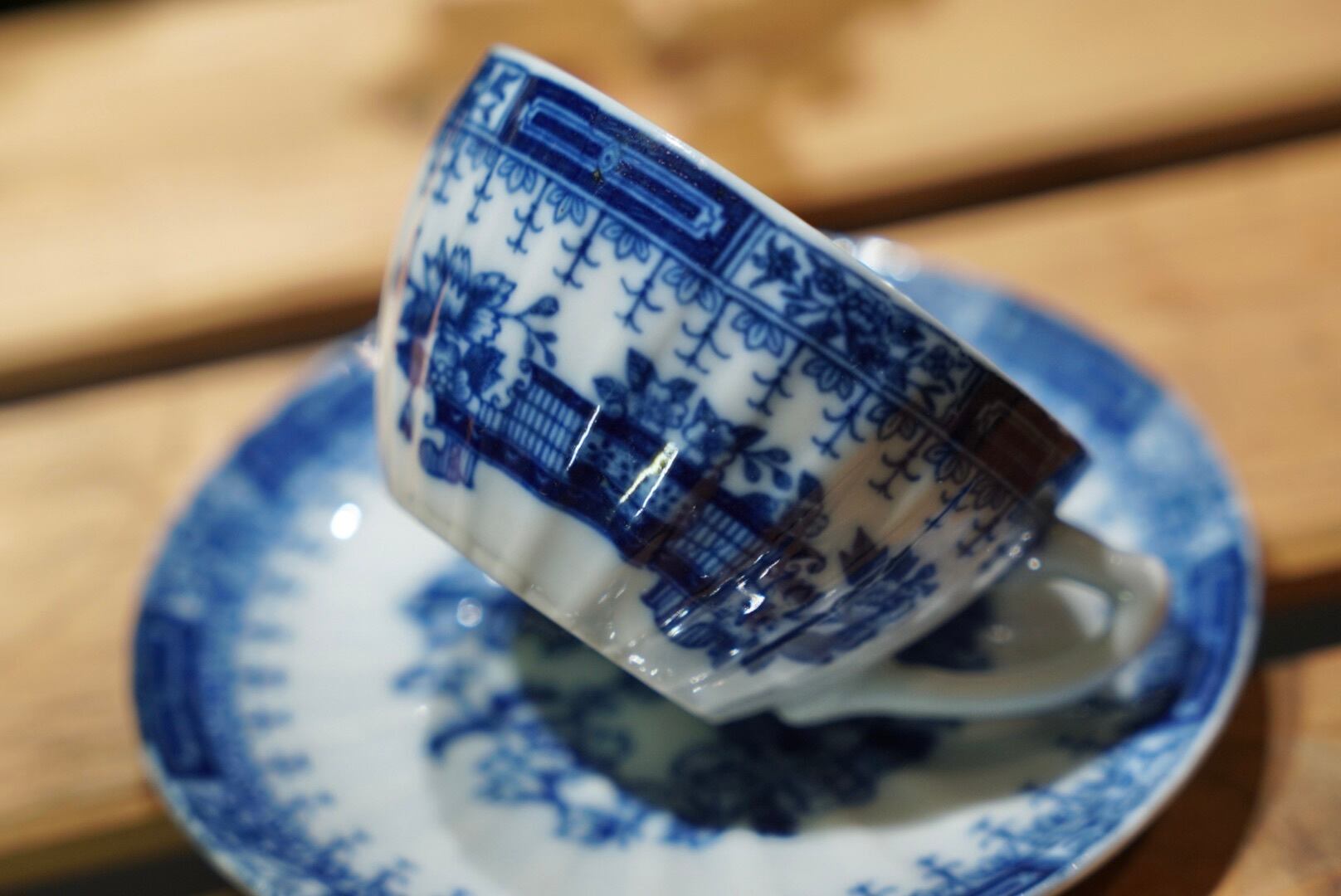 深く吸い込まれそうな藍色で描かれているのは、おそらくヨーロッパの人が遠い日に夢見た、東洋の風景。銅版転写ならではの繊細な線で、小さな花かごや不思議な植物が丁寧に写し取られています。