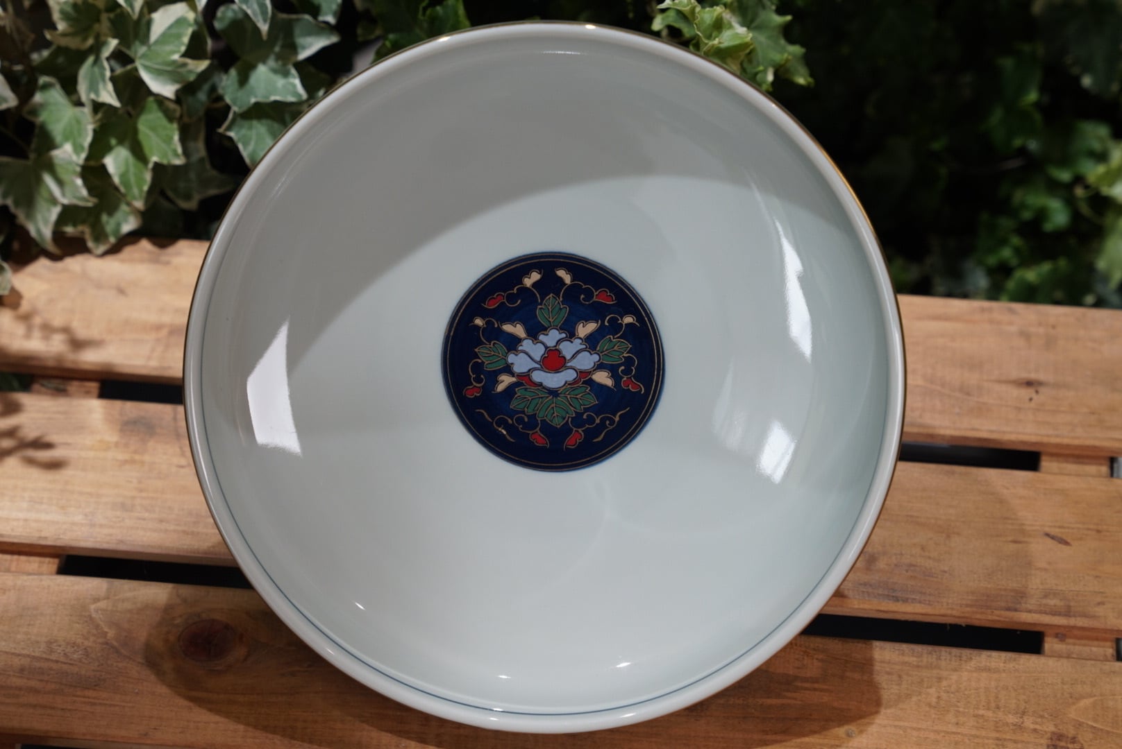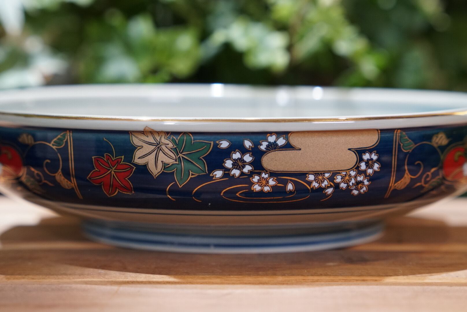 瑠璃に咲く四季文 有田・末峰窯 金彩染錦の浅鉢(盛鉢)