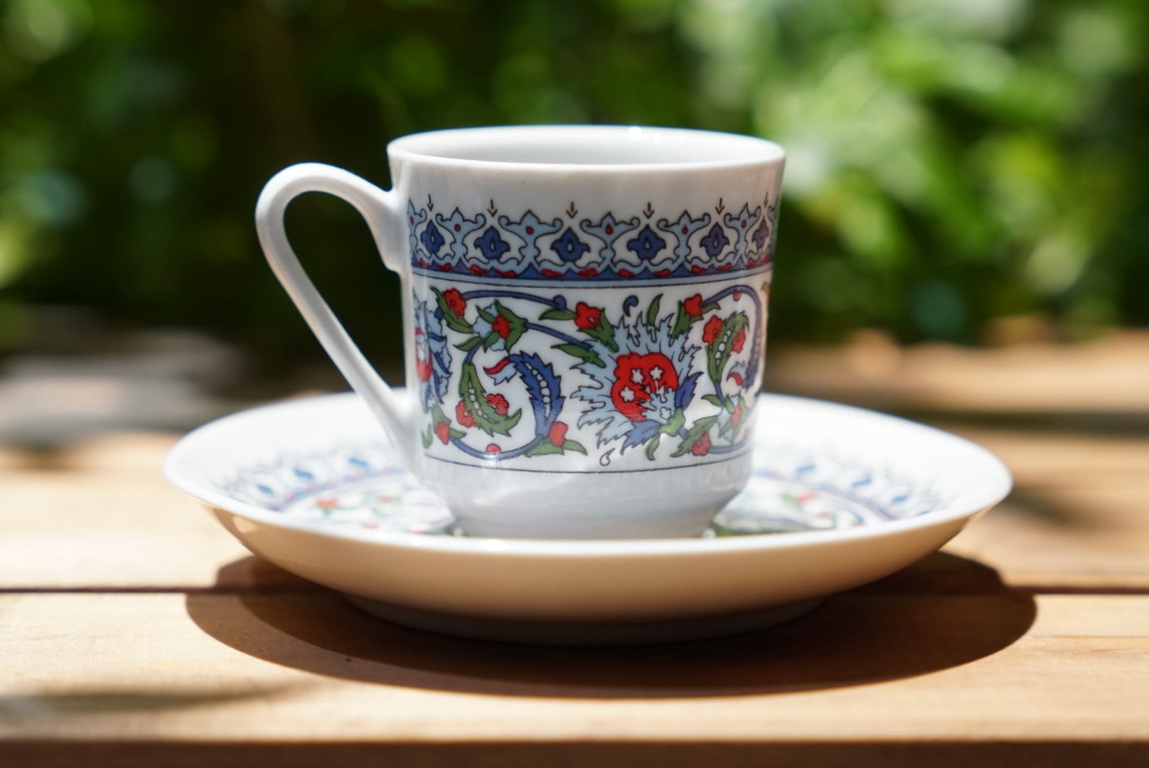白磁のキャンバスに、トルコ伝統の草花模様が咲き誇るデミタスカップ&ソーサー。