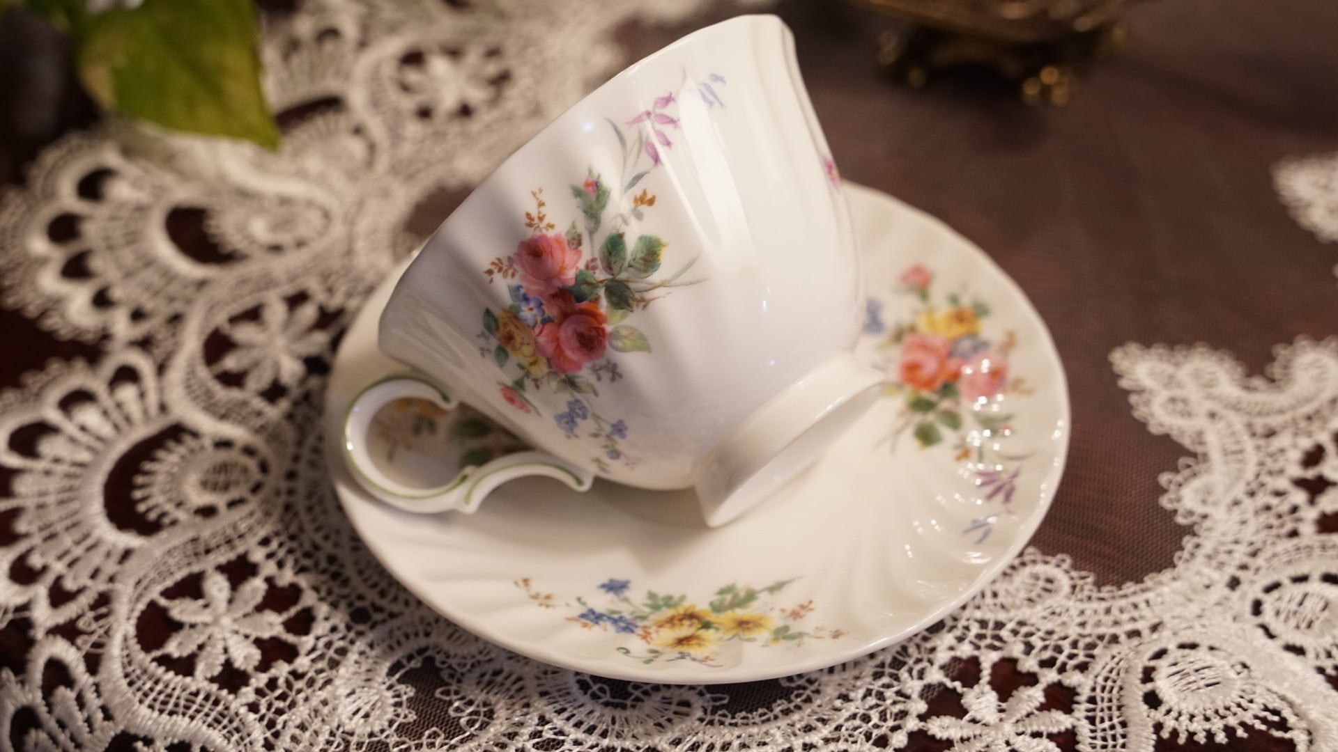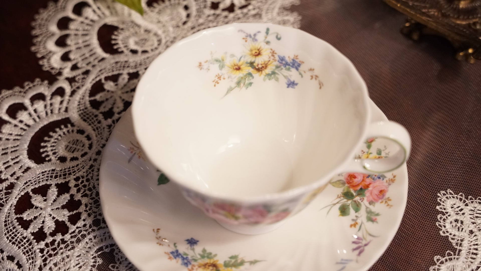 ソーサーにはゆるやかなリーフ状のフルーテッド(段彫り)が施され、光の陰影が静かに揺れます。