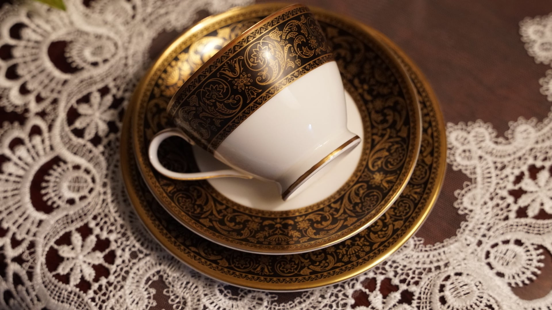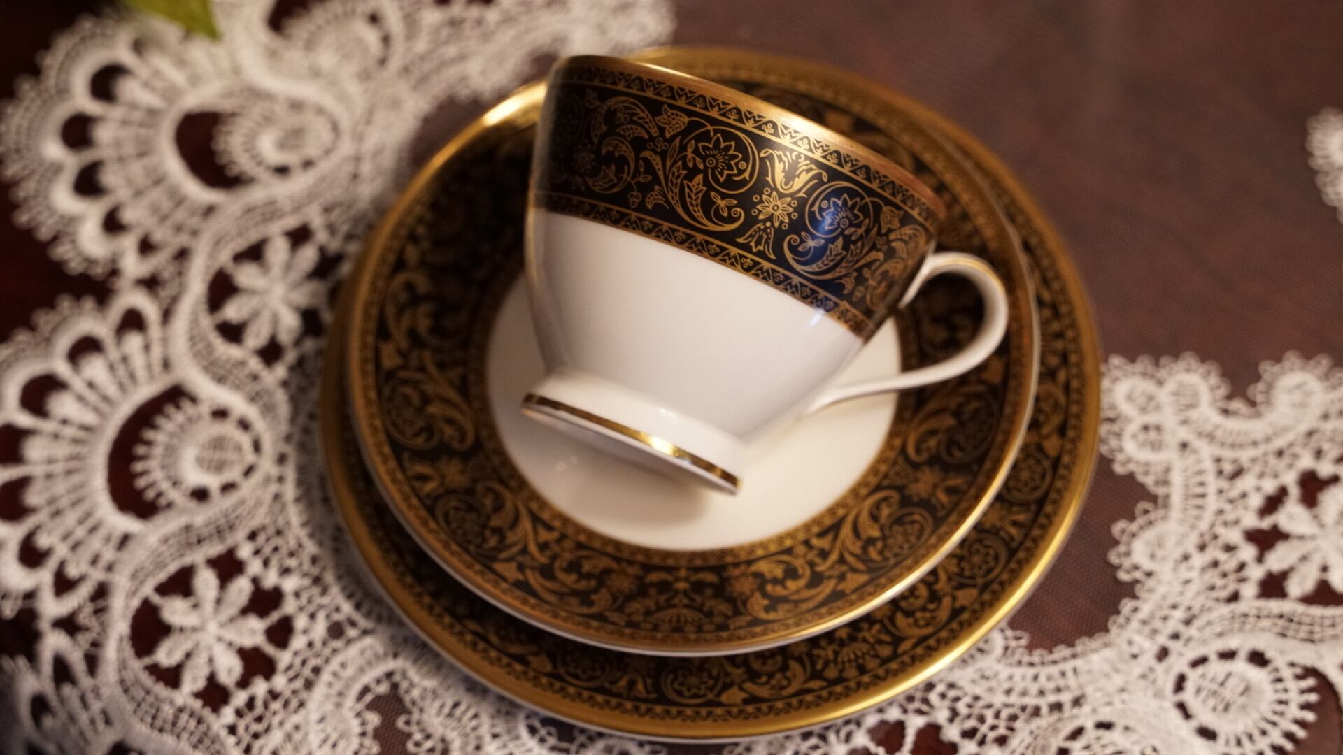 カップの縁をやさしくなぞる金のラインは、光の角度によって繊細に表情を変えます。