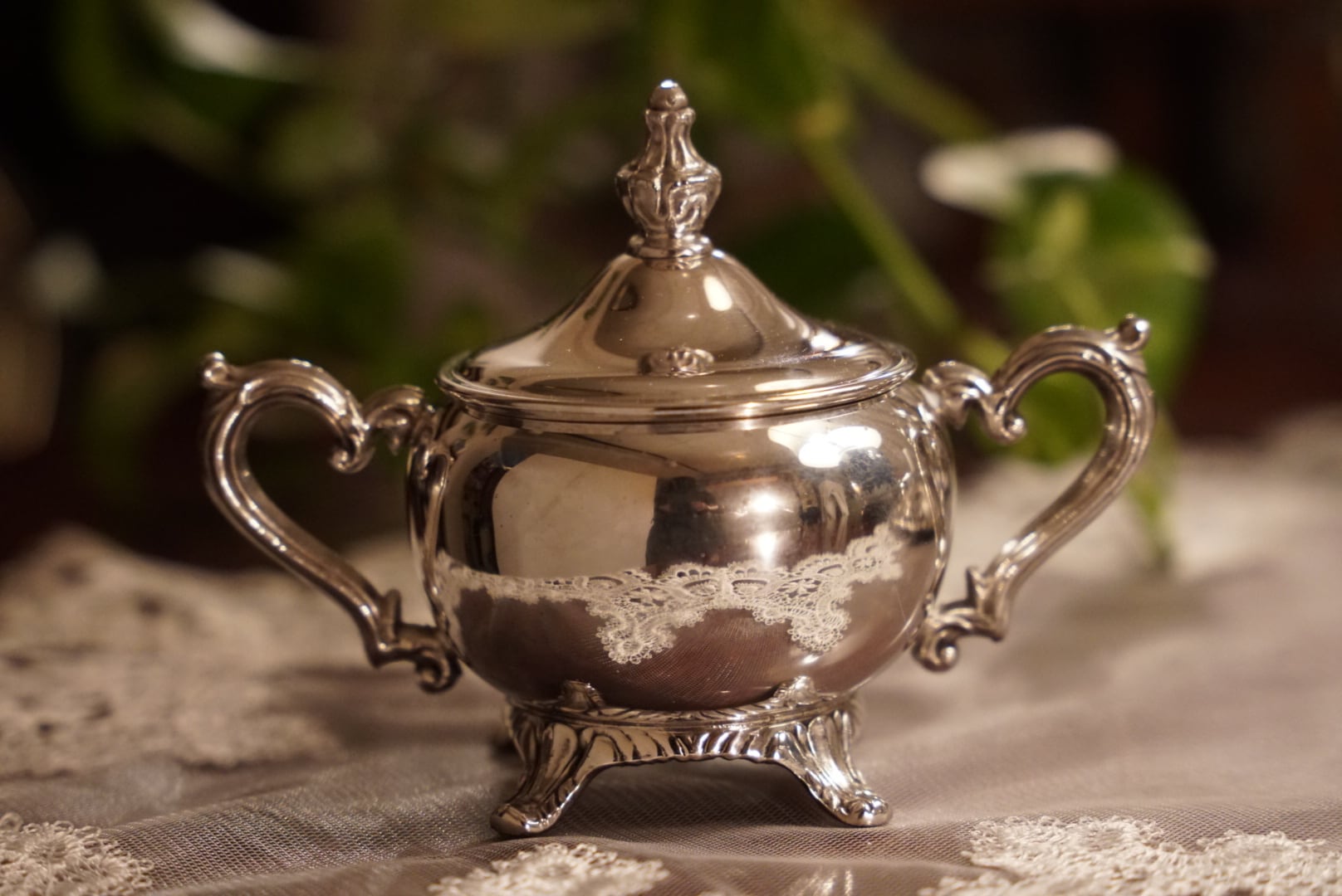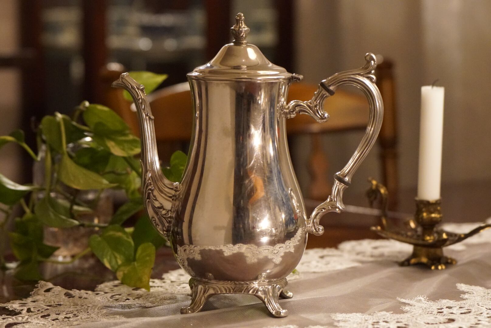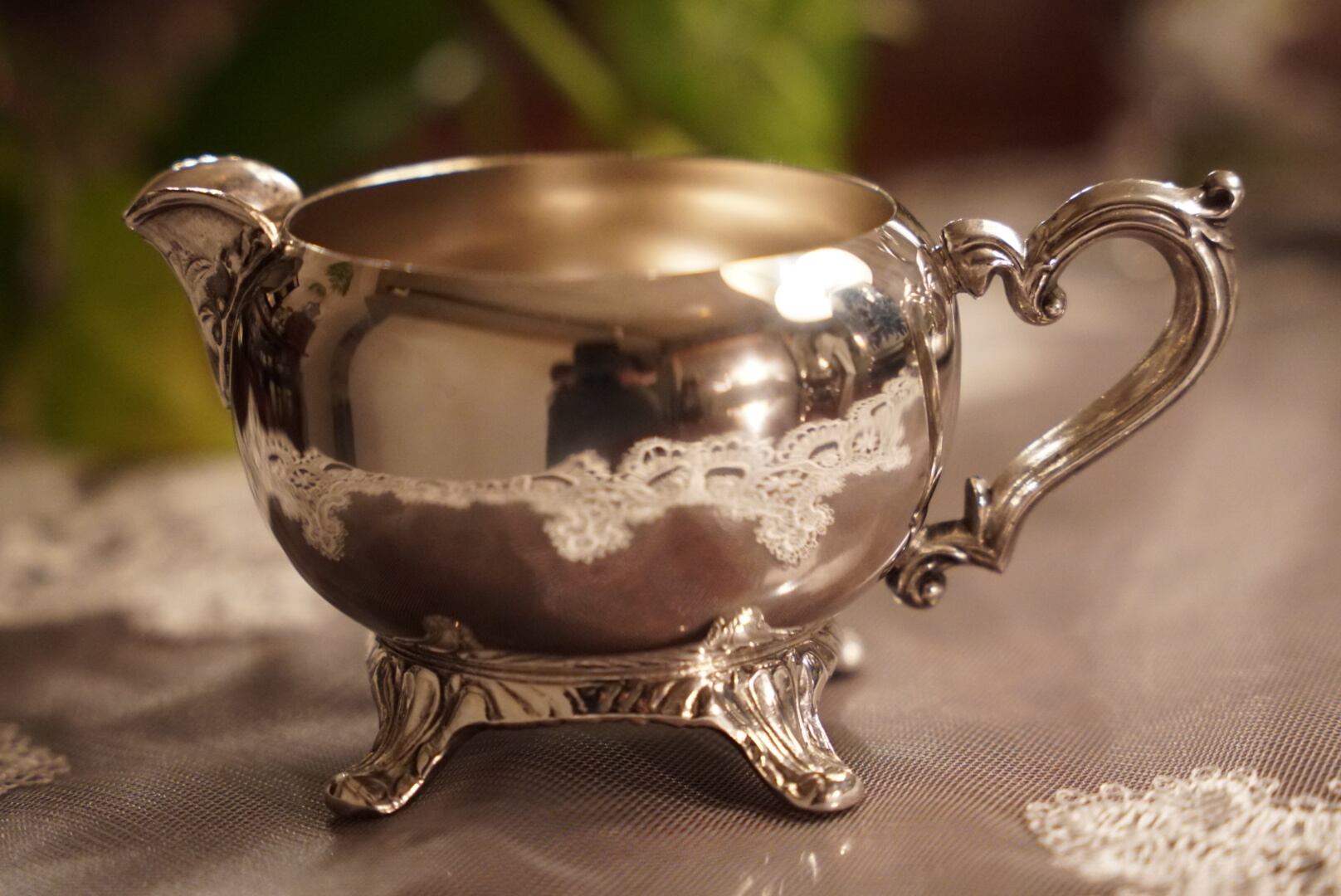 一つ一つが優雅な曲線を描き、細やかな装飾と小さな猫足のような安定感ある脚を持つクラシカルなデザインは1940〜1960年代のアメリカのシルバープレート食器の典型的なスタイル。