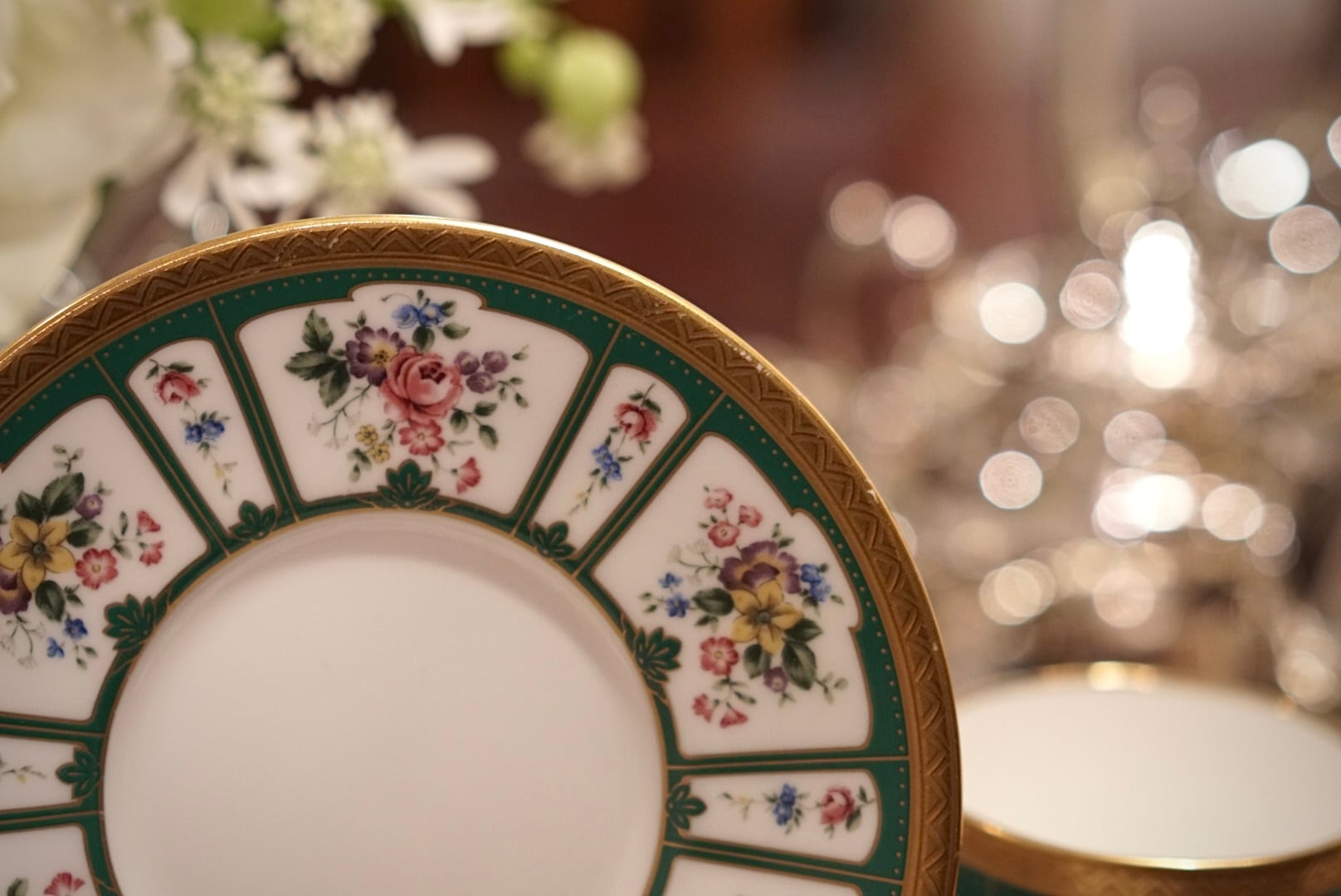 金彩の縁取りが全体を格調高く引き締め、テーブルに置くだけでその場がパッと華やぐような、貴婦人のような佇まいです。