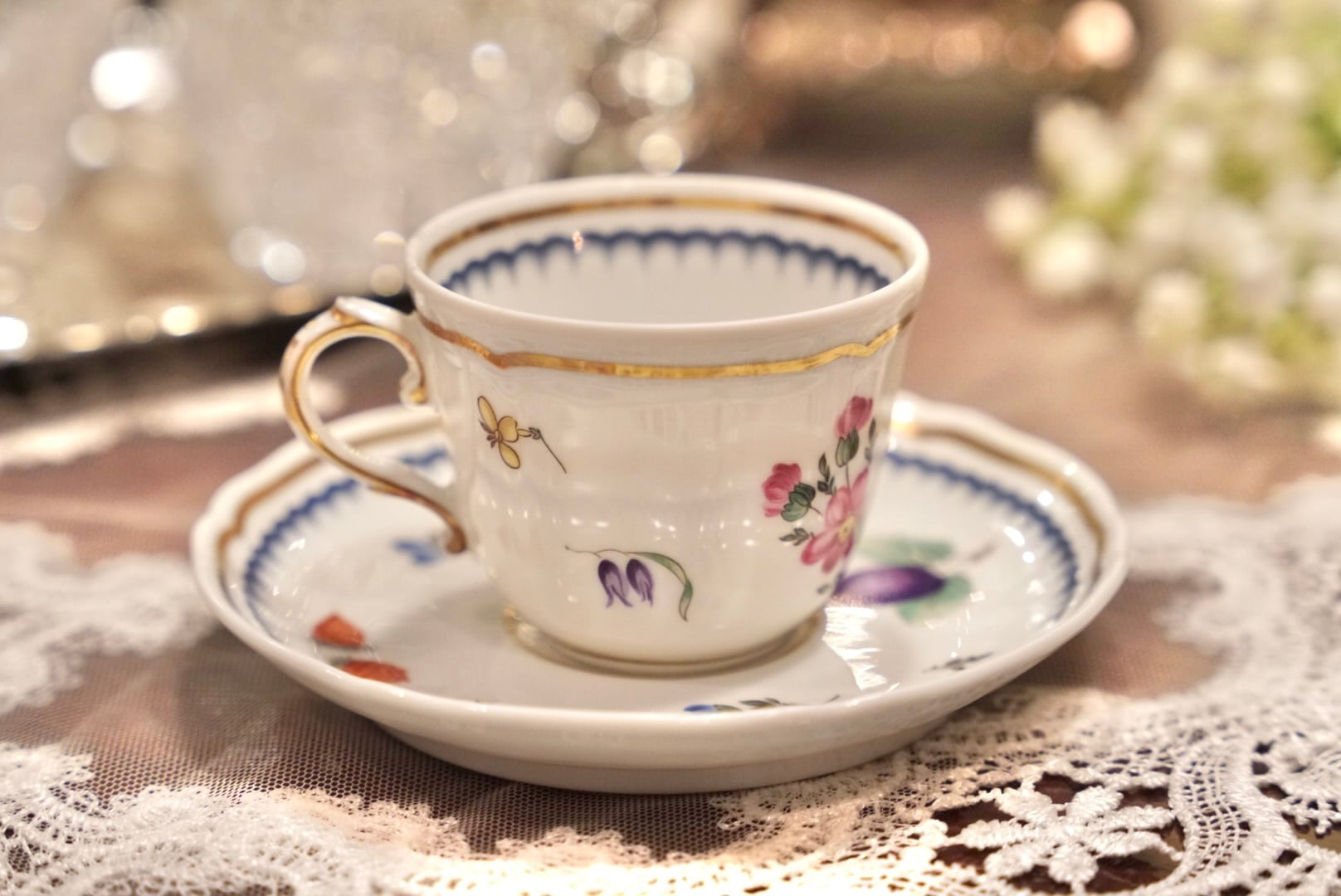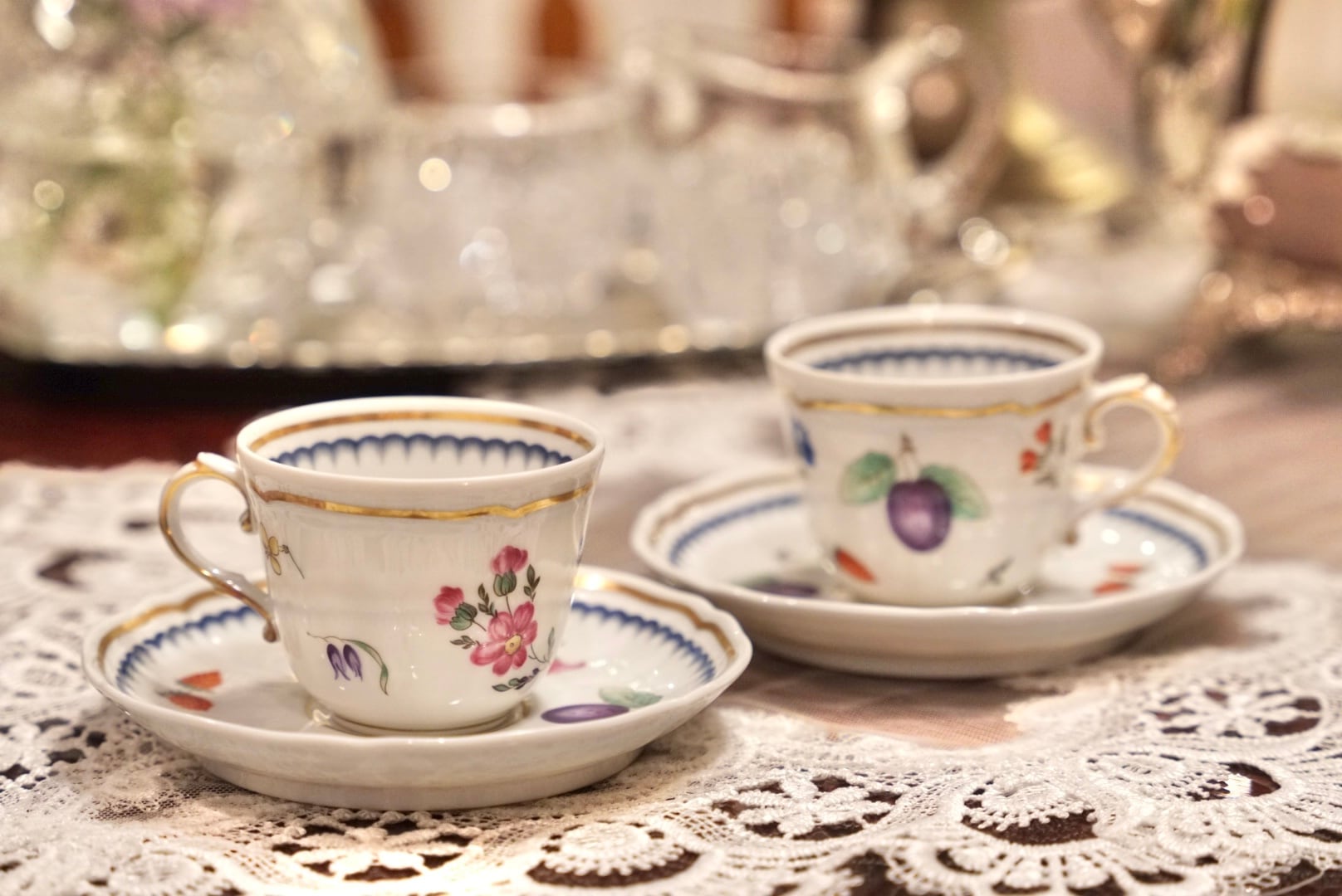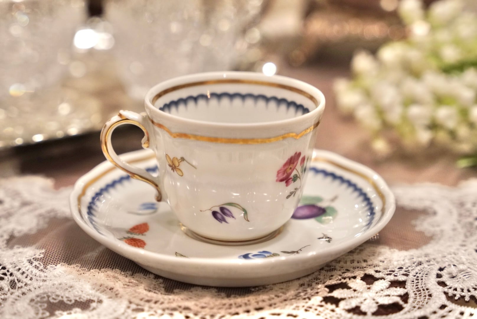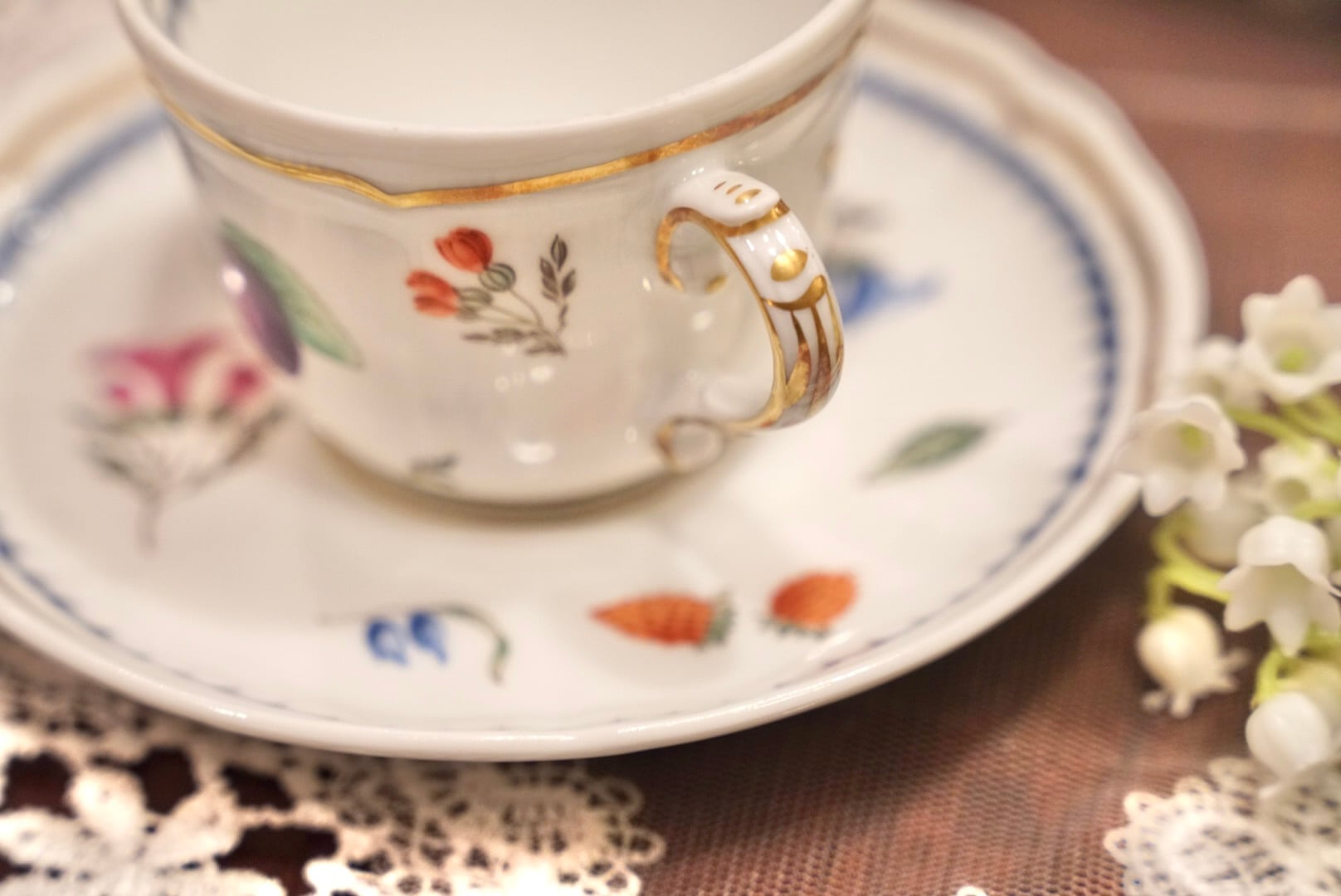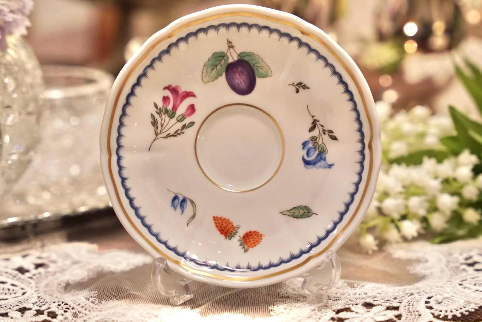 ブルーのスカラップボーダーと金彩のラインが全体を上品に引き締め、2客それぞれ異なるフルーツと花が描かれているのも、並べて眺める楽しさがあります。