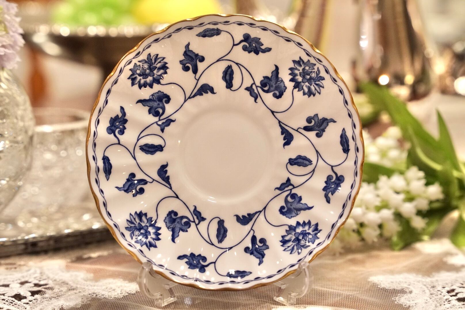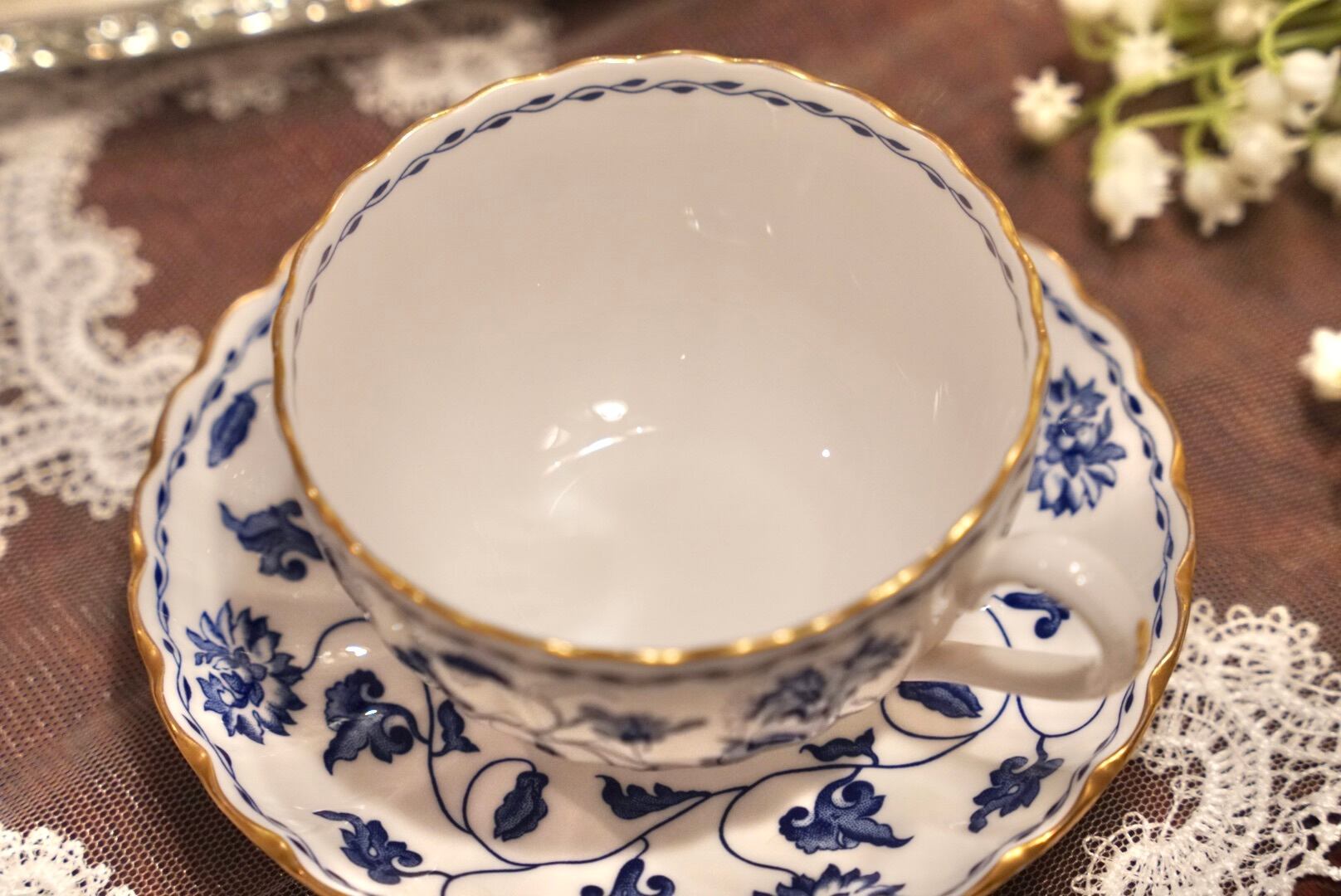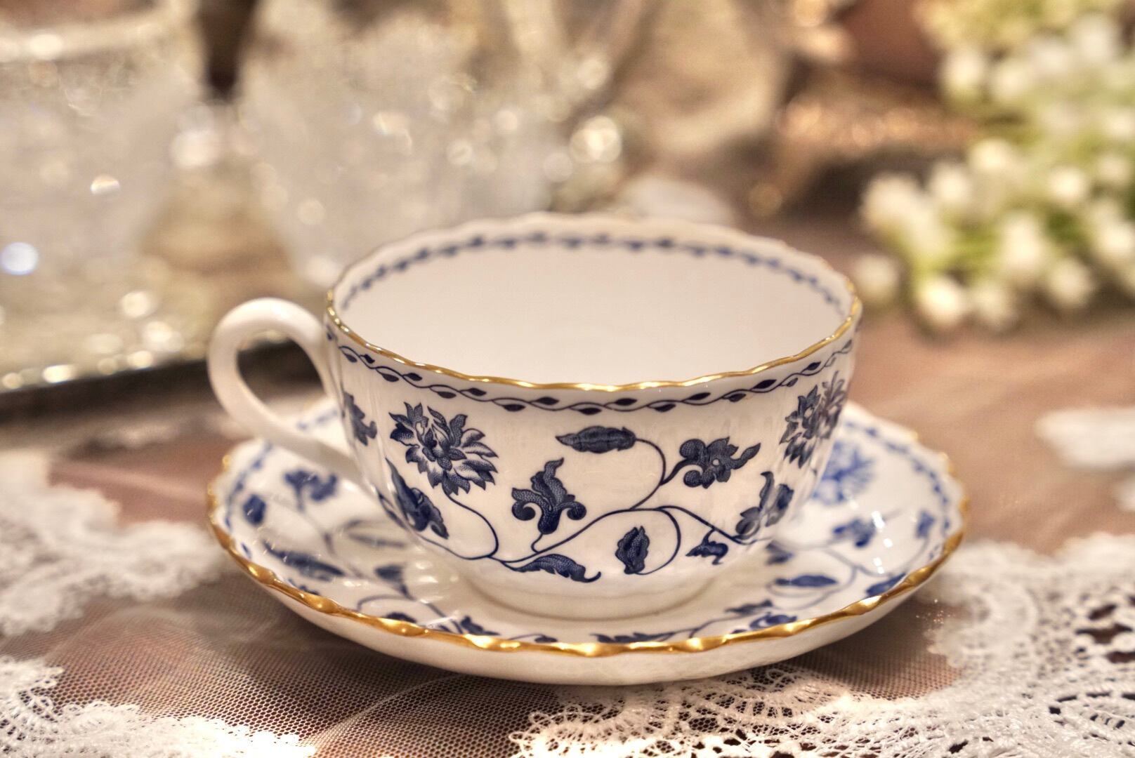 ボーンチャイナの繊細さを活かしたフルーテッドの美しいフォルムに、エレガントなブルーと金彩 が映え、シンプルながらも格調高い佇まいです。