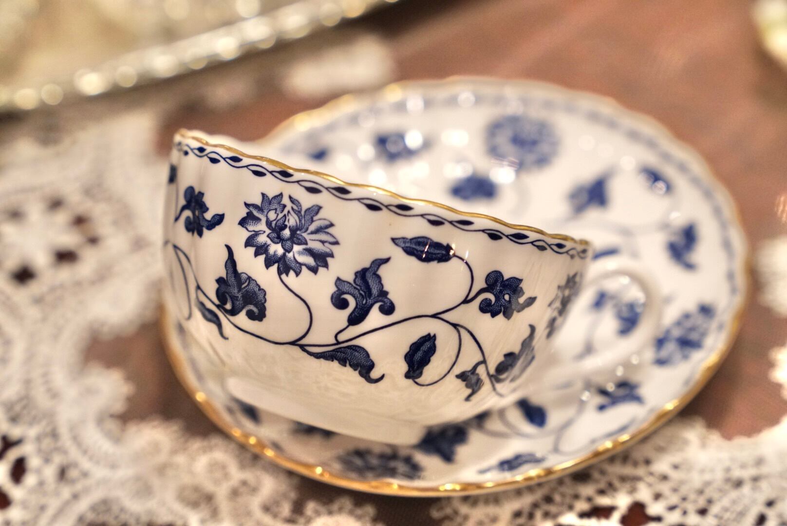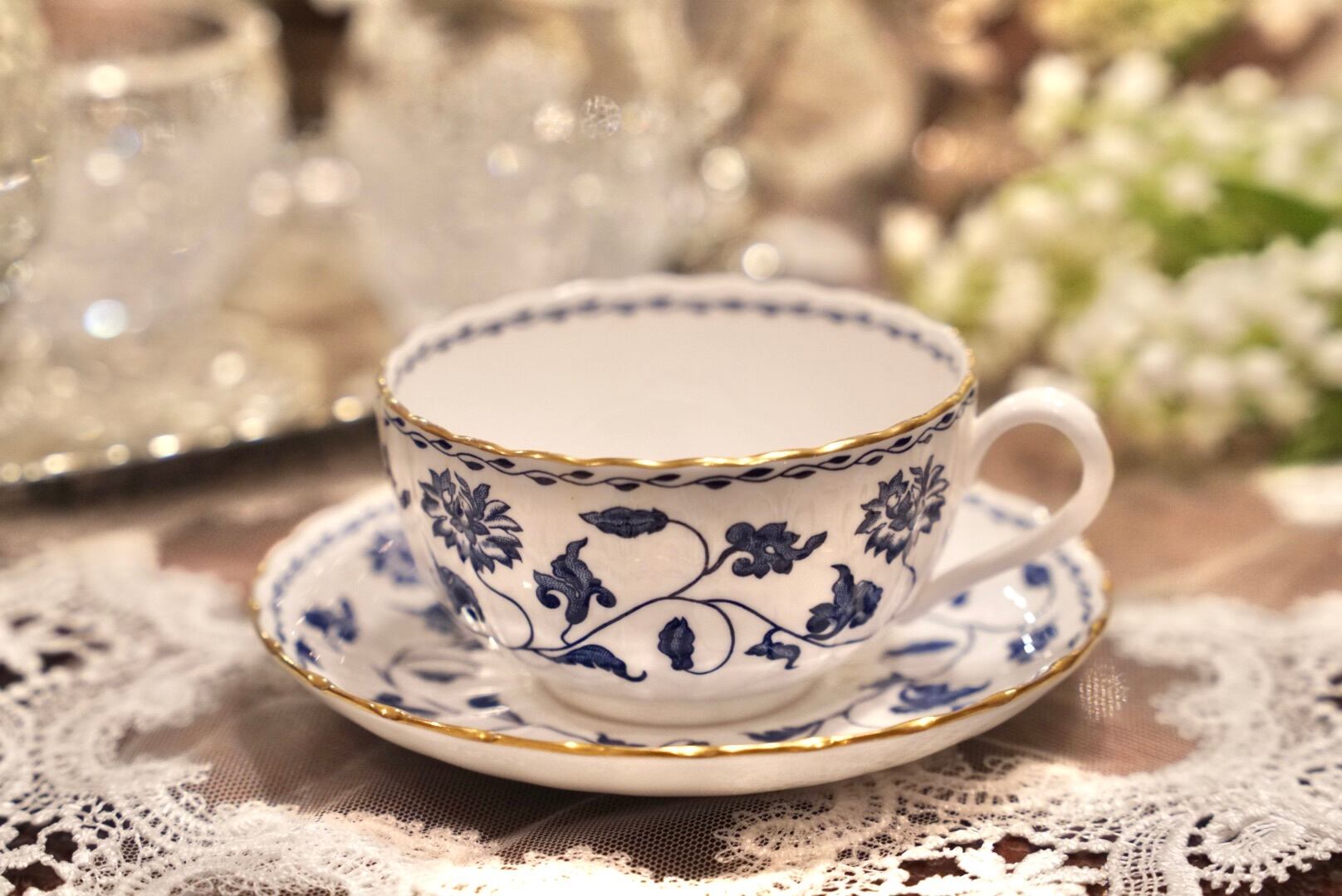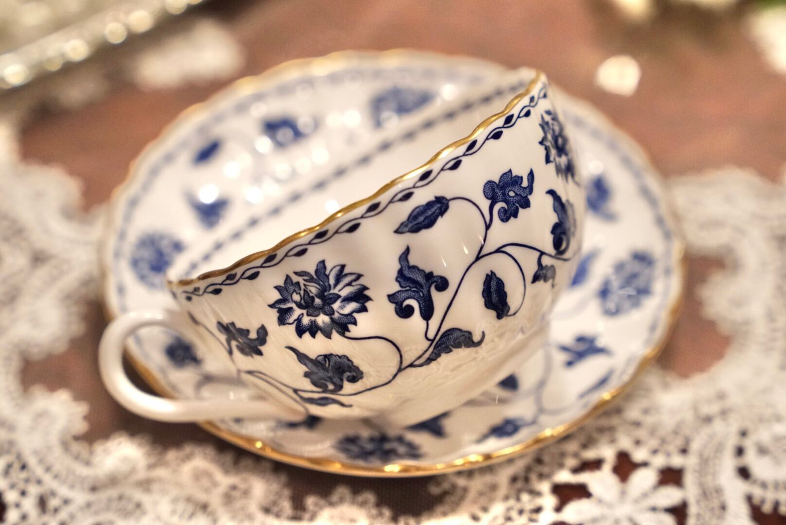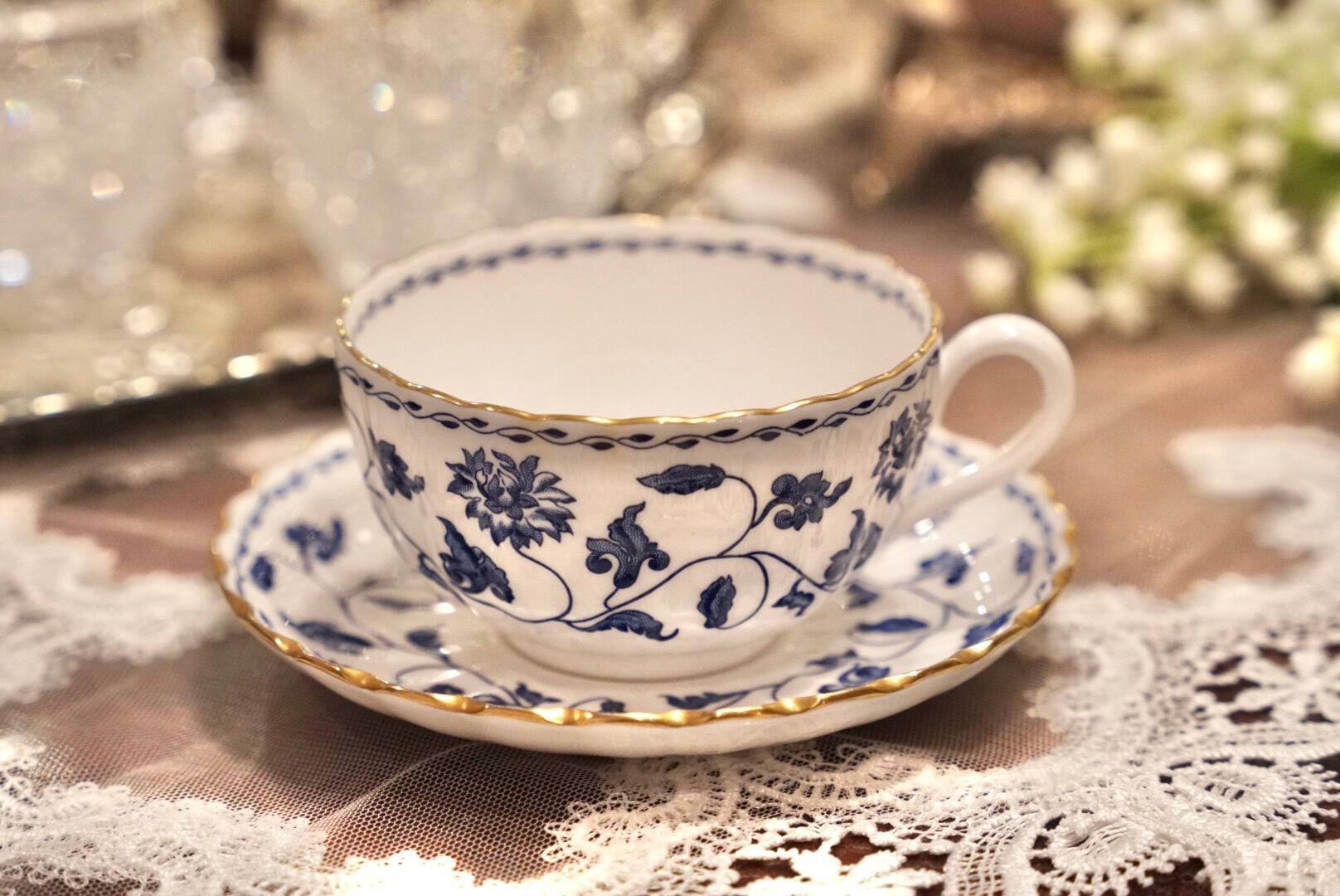 ボーンチャイナの繊細さを活かしたフルーテッドの美しいフォルムに、エレガントなブルーと金彩 が映え、シンプルながらも格調高い佇まいです。