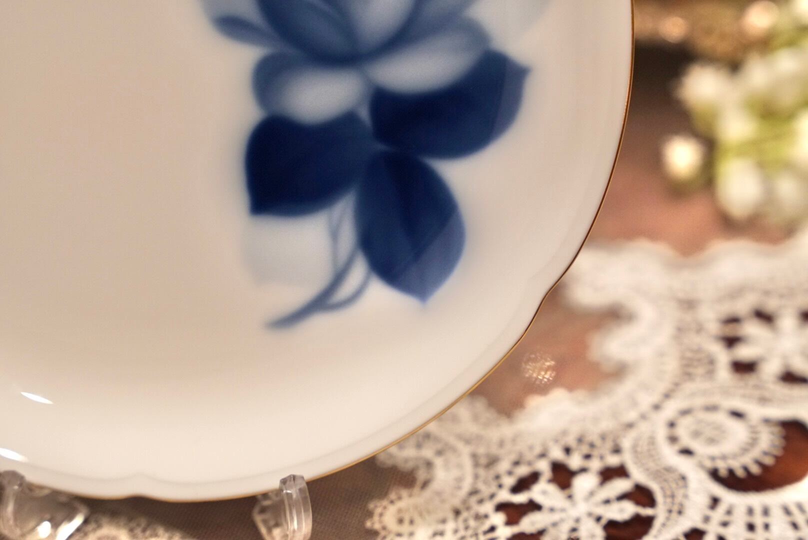 白磁の余白と紺青の薔薇のコントラストが凛として美しく、ケーキや和菓子をのせるだけで食卓が一段と格調高い雰囲気に変わります。
