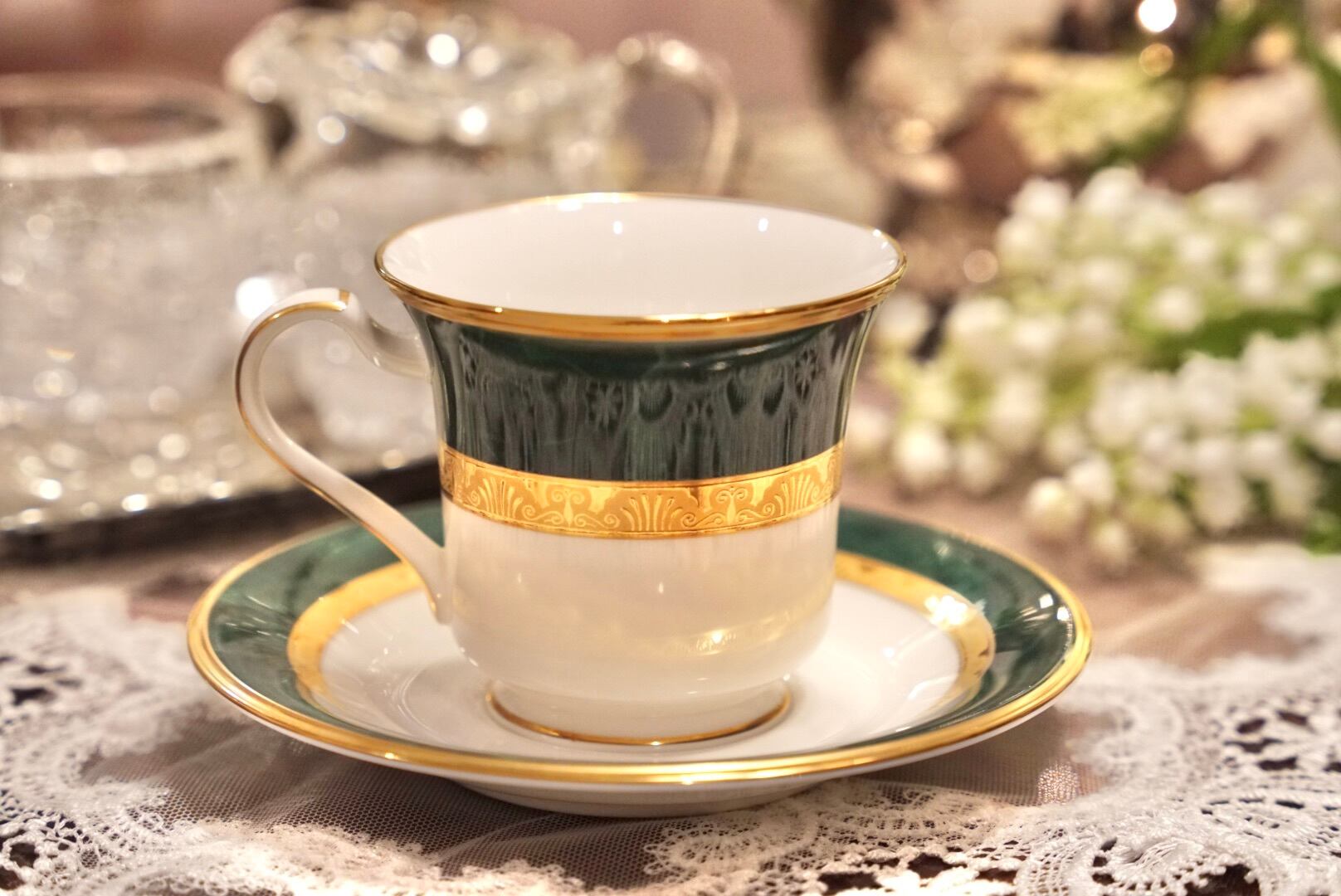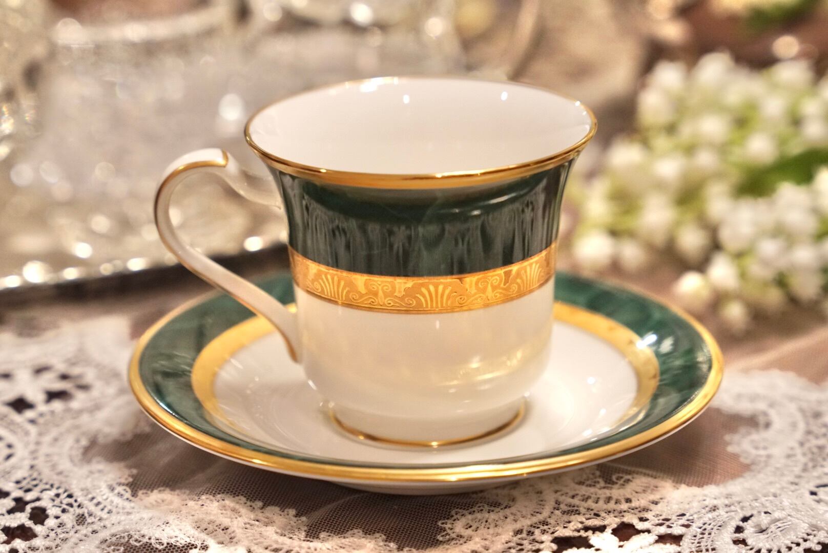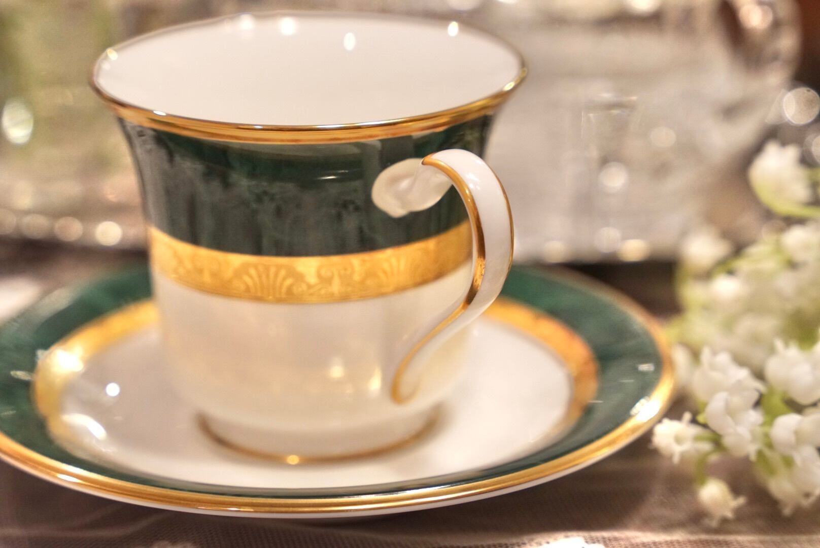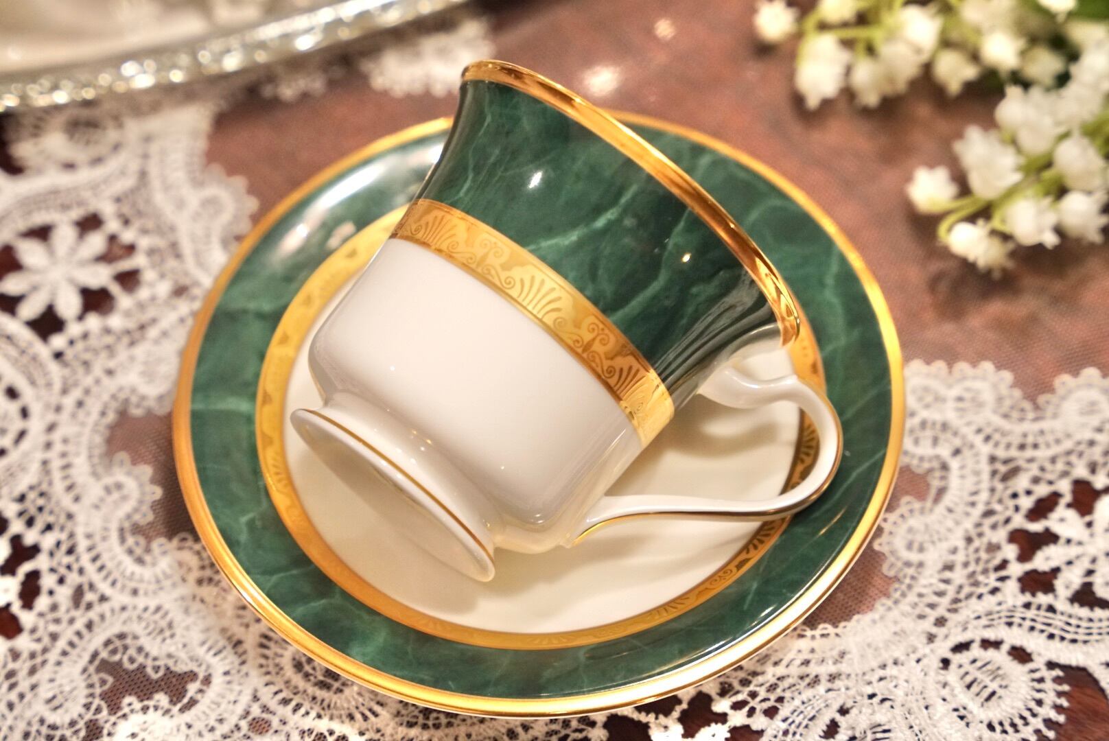 深みのあるグリーンと輝くゴールドの組み合わせは、まるで格式あるクラブやホテルのラウンジを思わせる品格があり、コーヒータイムをひとときの贅沢な空間へと変えてくれます。