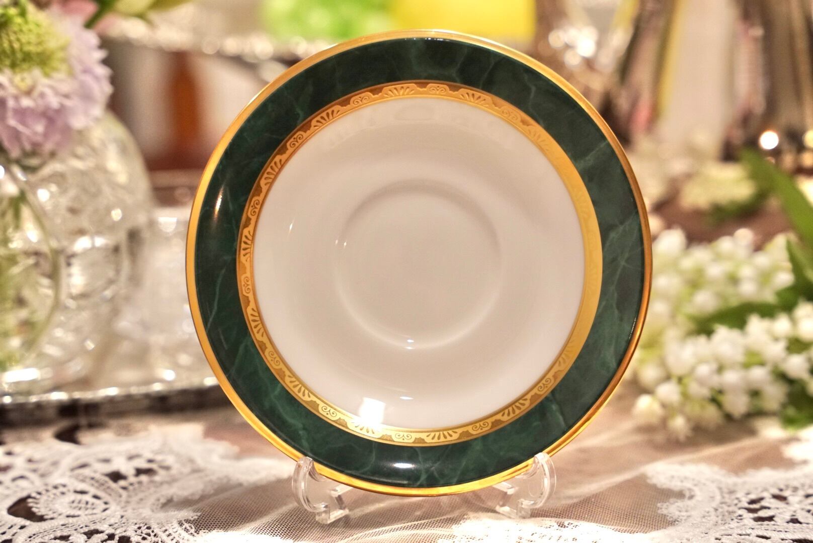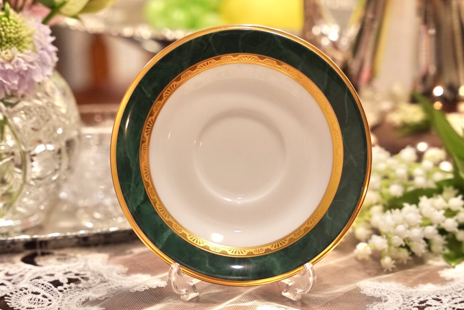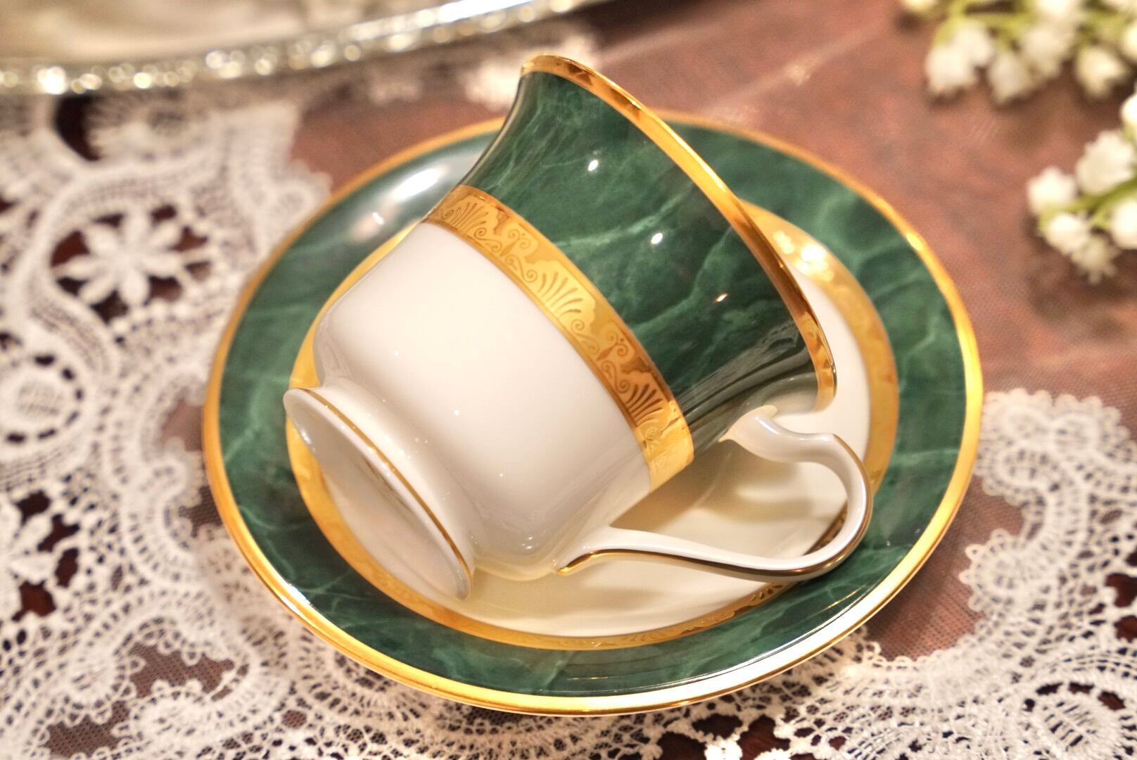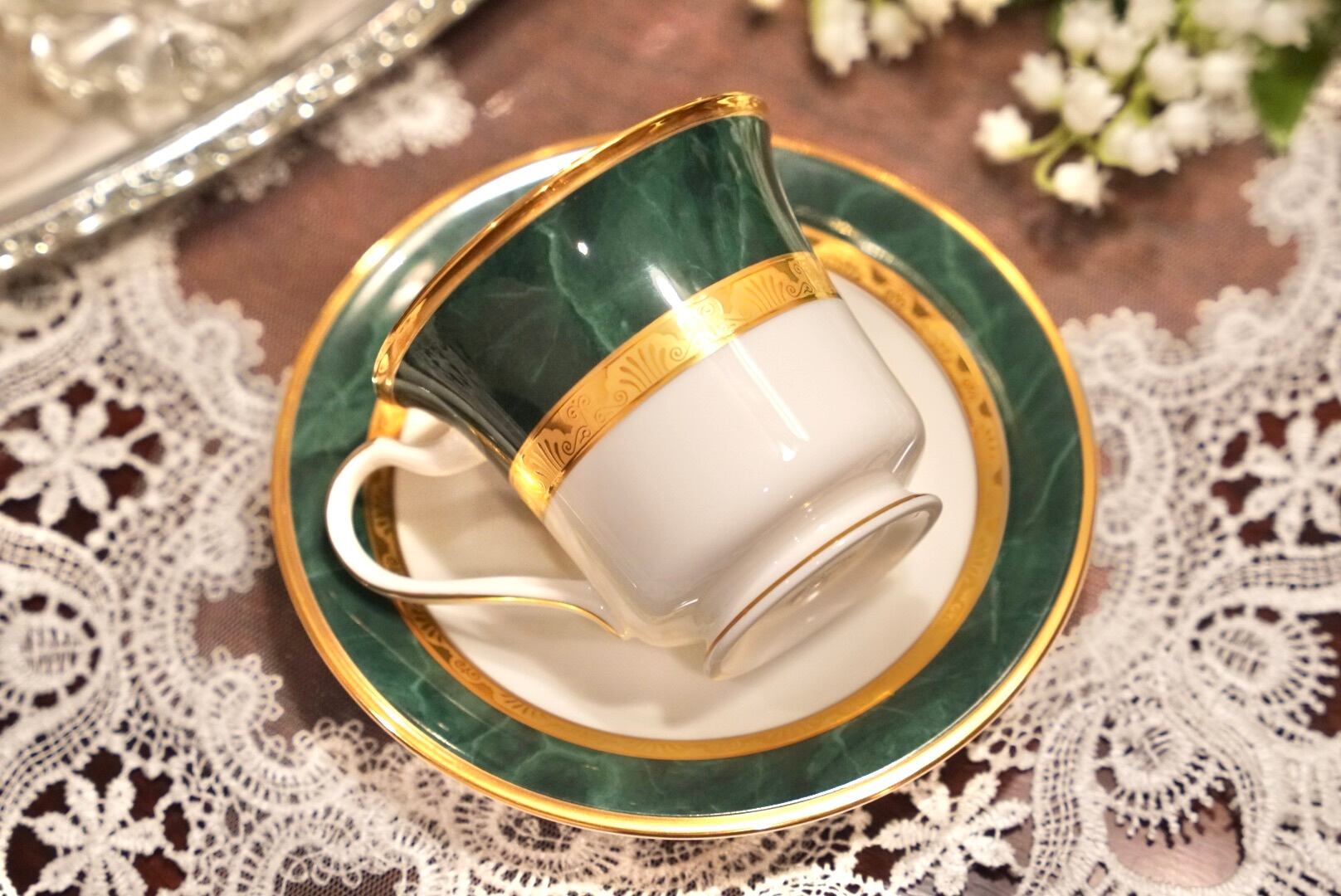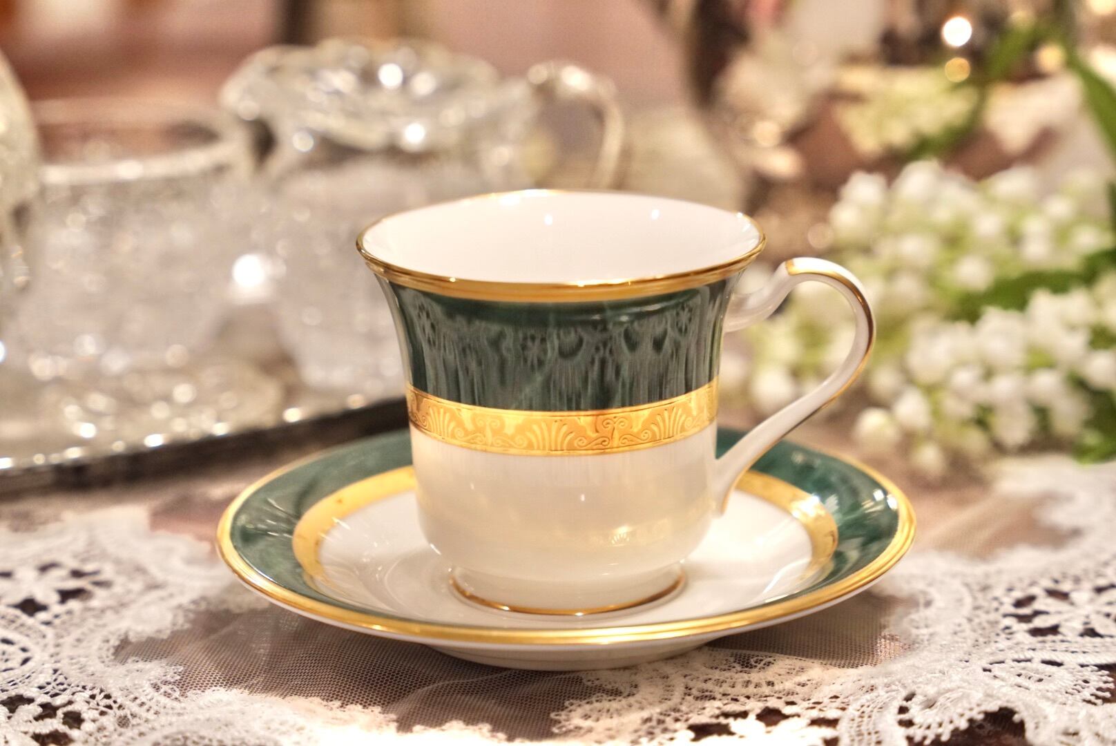 深みのあるグリーンと輝くゴールドの組み合わせは、まるで格式あるクラブやホテルのラウンジを思わせる品格があり、コーヒータイムをひとときの贅沢な空間へと変えてくれます。