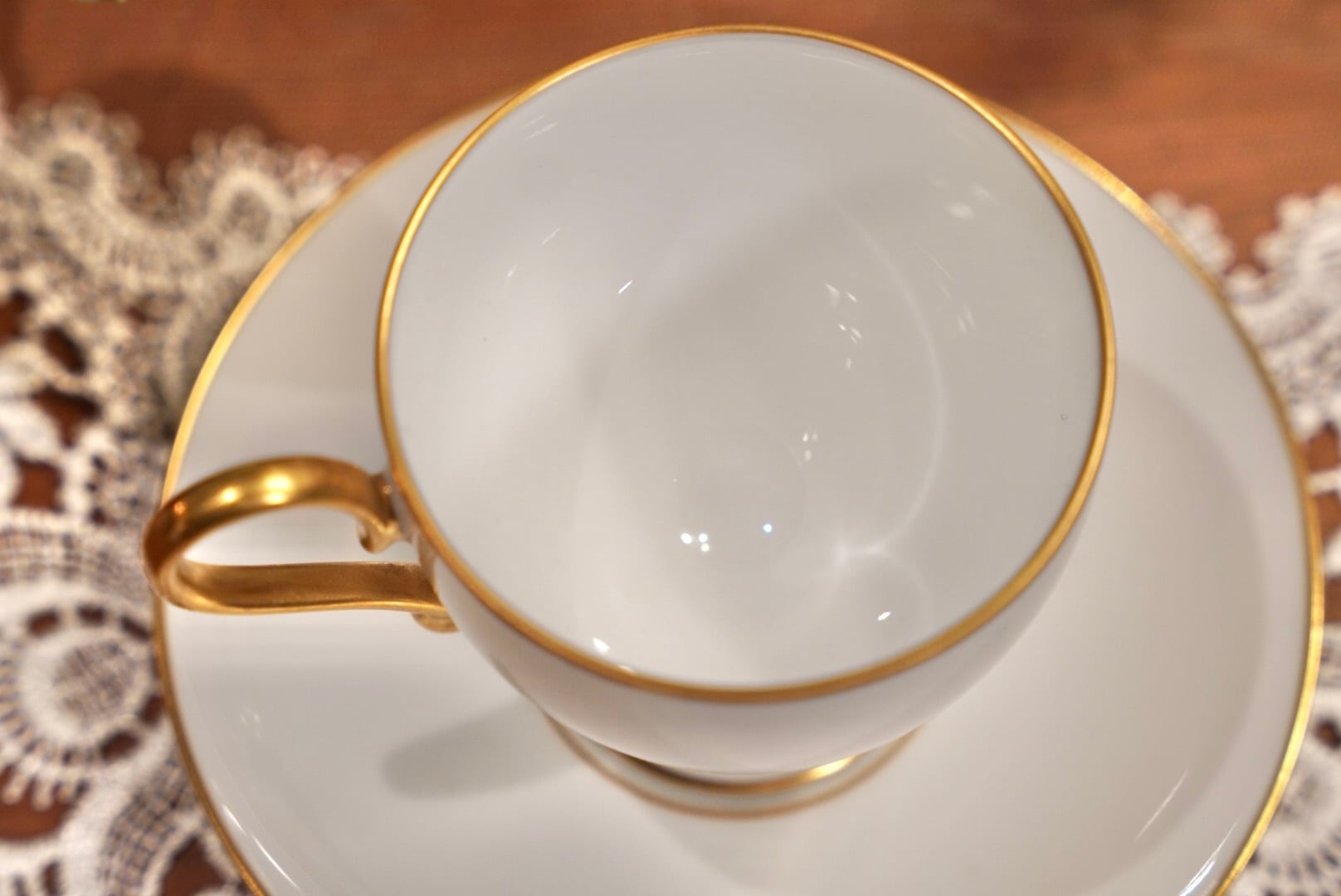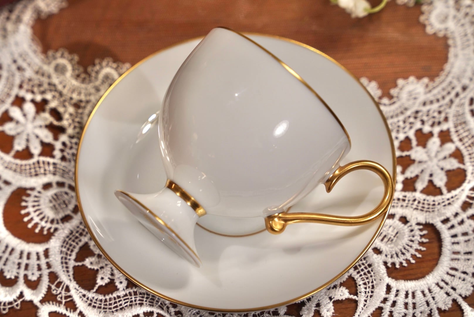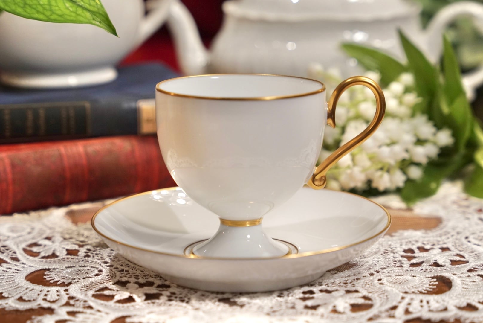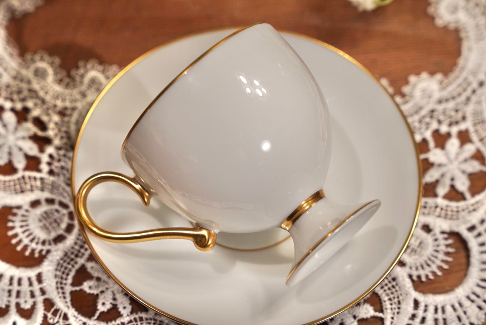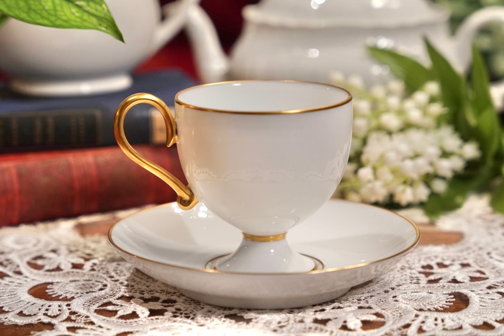 1904年創業の Noritake(ノリタケ) より、白磁×金彩のコーヒーカップ&ソーサーをご紹介します。 花柄も色も一切持たず、ただ純白の磁器と輝くゴールドだけで構成されたこの一客。 高台に乗った端正なシルエットと、すっと伸びたゴールドのハンドルが、シンプルでありながら凛とした気品を漂わせます。 余白の多い白磁は置く場所を選ばず、どんなインテリアにも静かに馴染みます。 商品詳細 状態:スレあり 内容:デミタスカップ × 1、ソーサー × 1 生産国:日本製