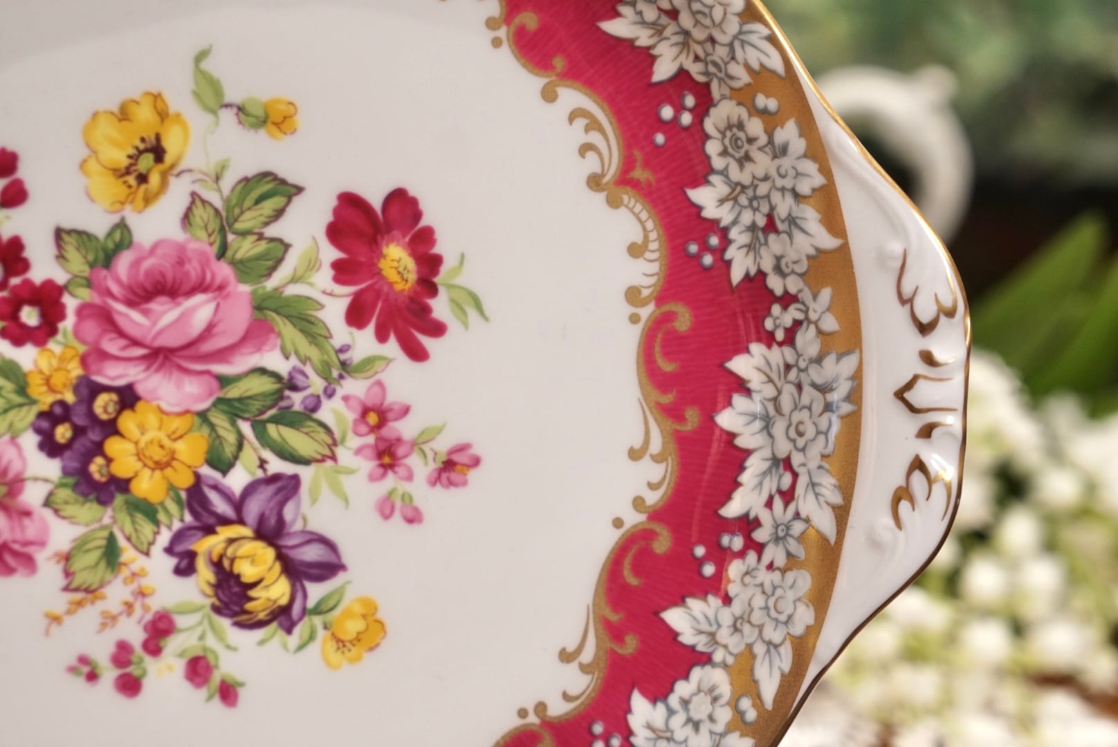 中央に豊かに咲くピンクのバラ、パープルのビオラ、イエローのパンジーのブーケ。それを囲む深みのあるクランベリーレッドのボーダーには白い花々が繊細に描かれ、金彩の唐草文様がその華やかさをいっそう引き立てます。