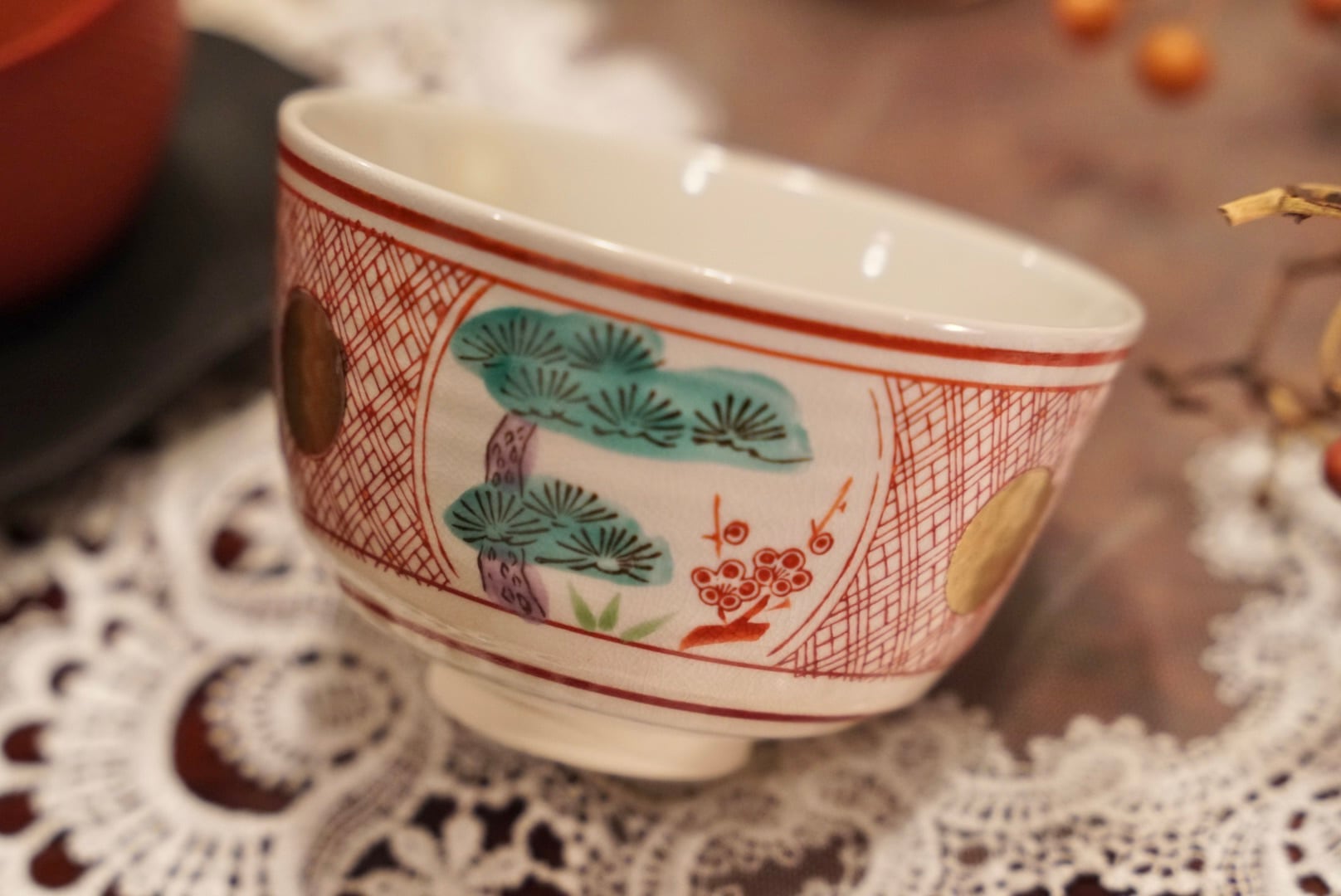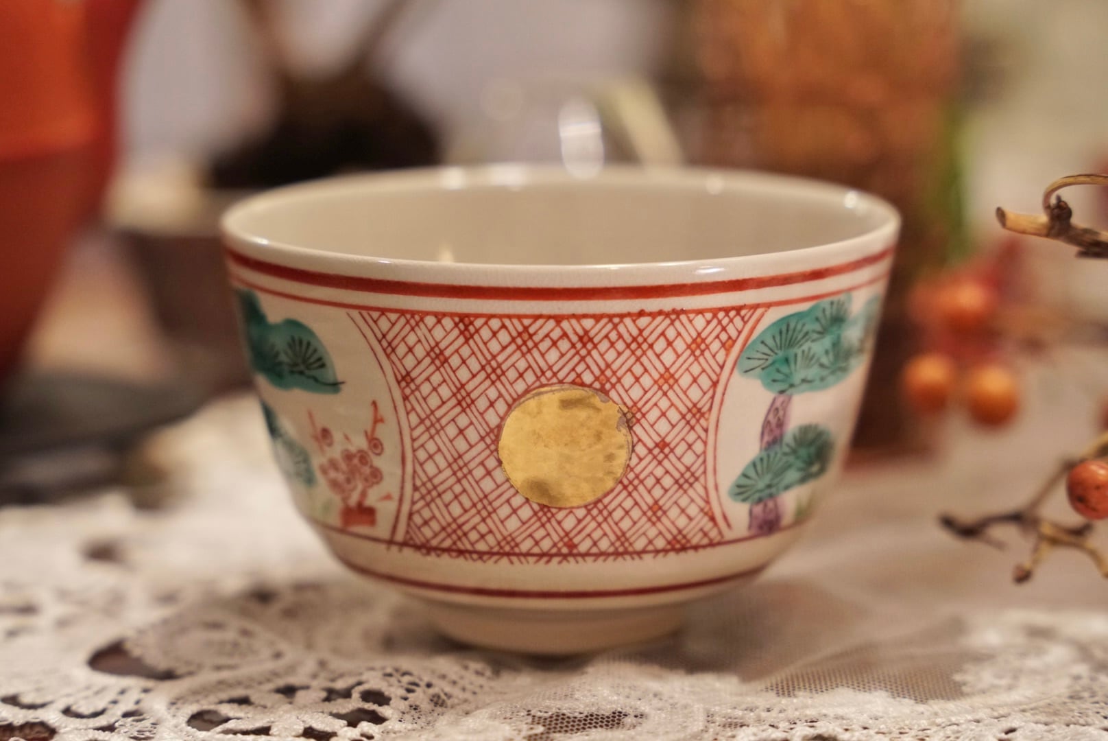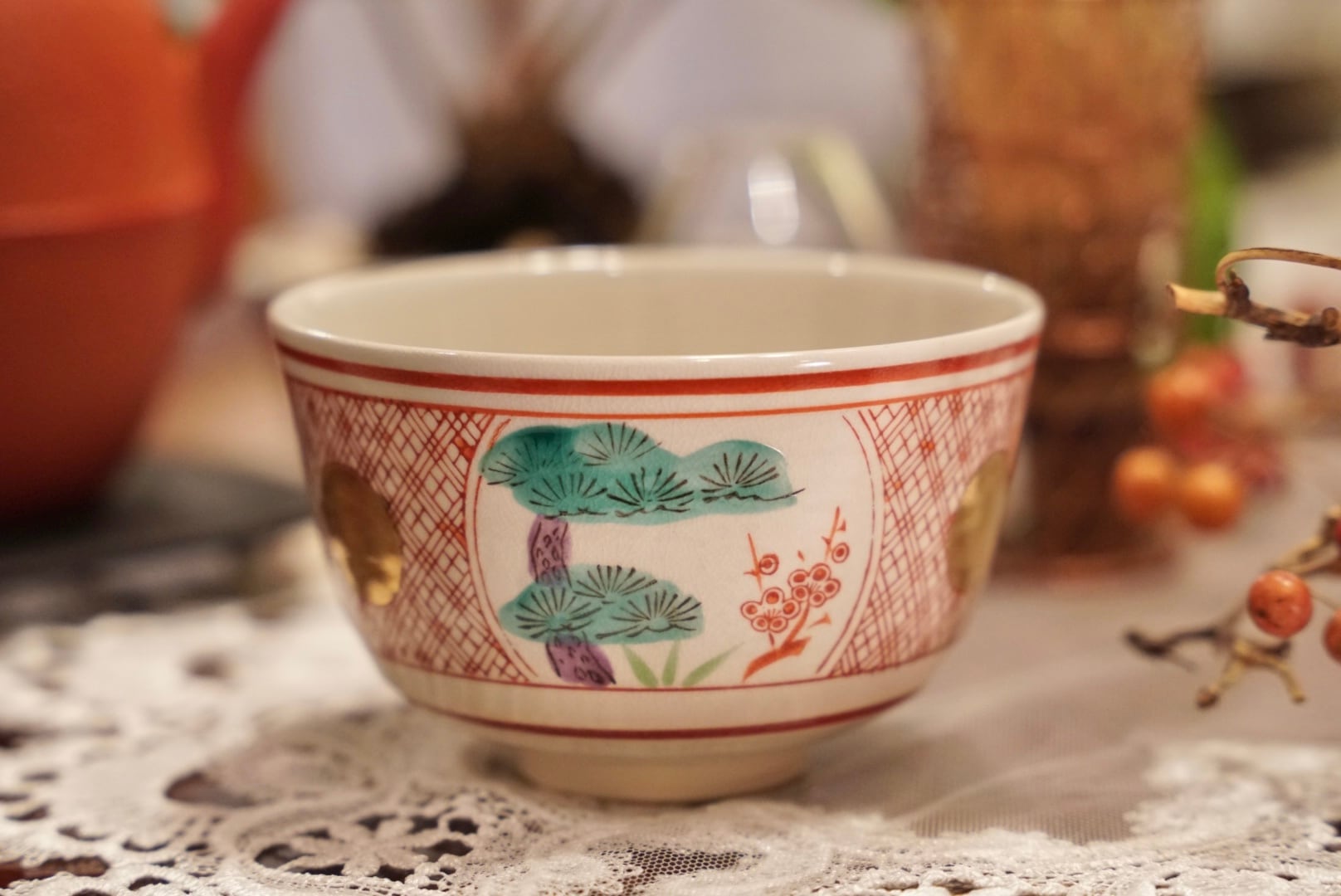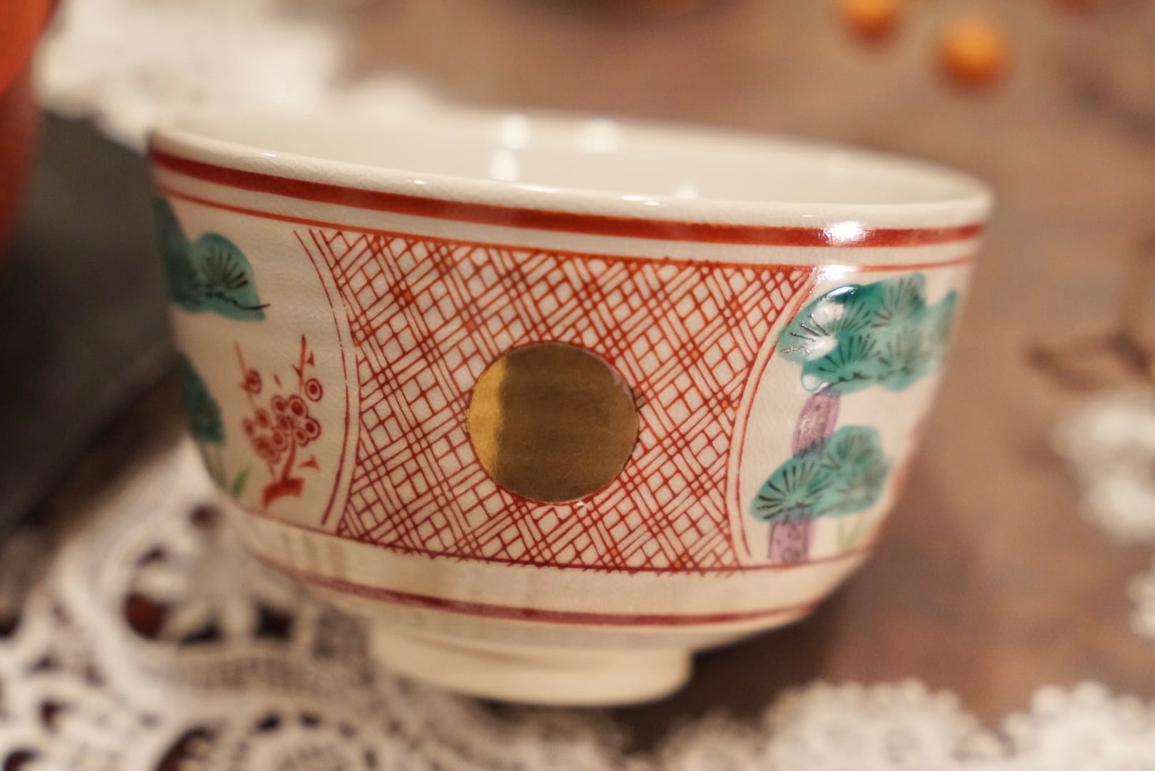 【京焼】加藤昌山造 松梅岩文 抹茶椀 赤絵 格子地紋 金彩 日本製 ヴィンテージ