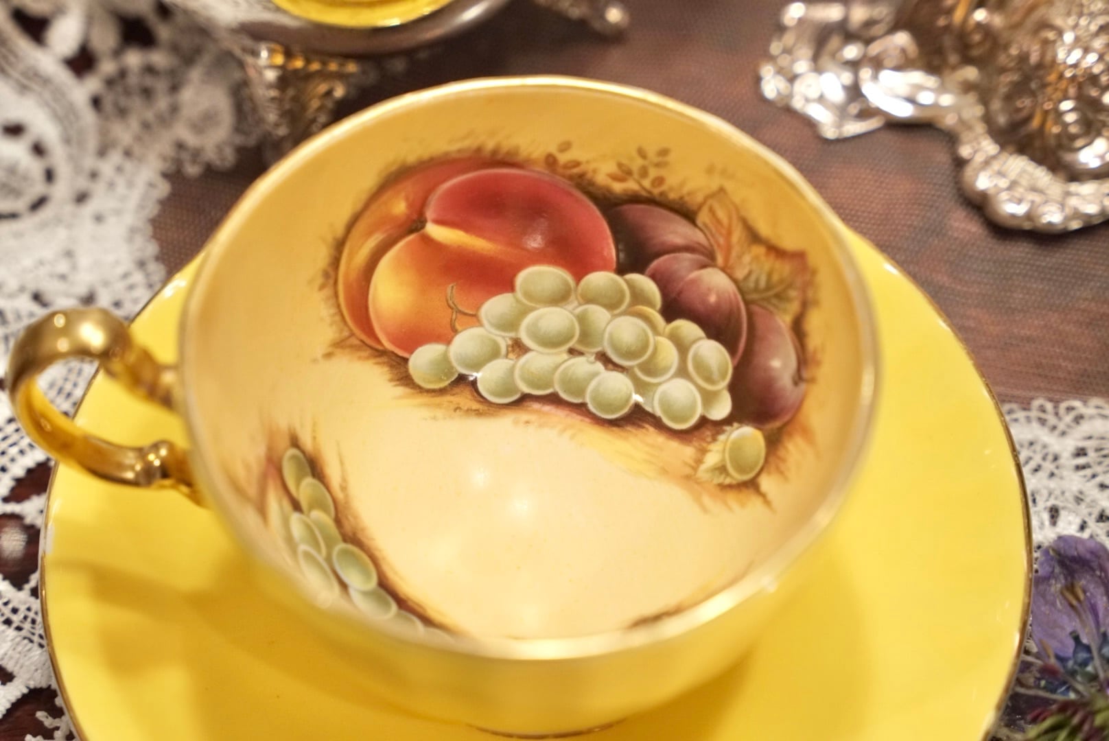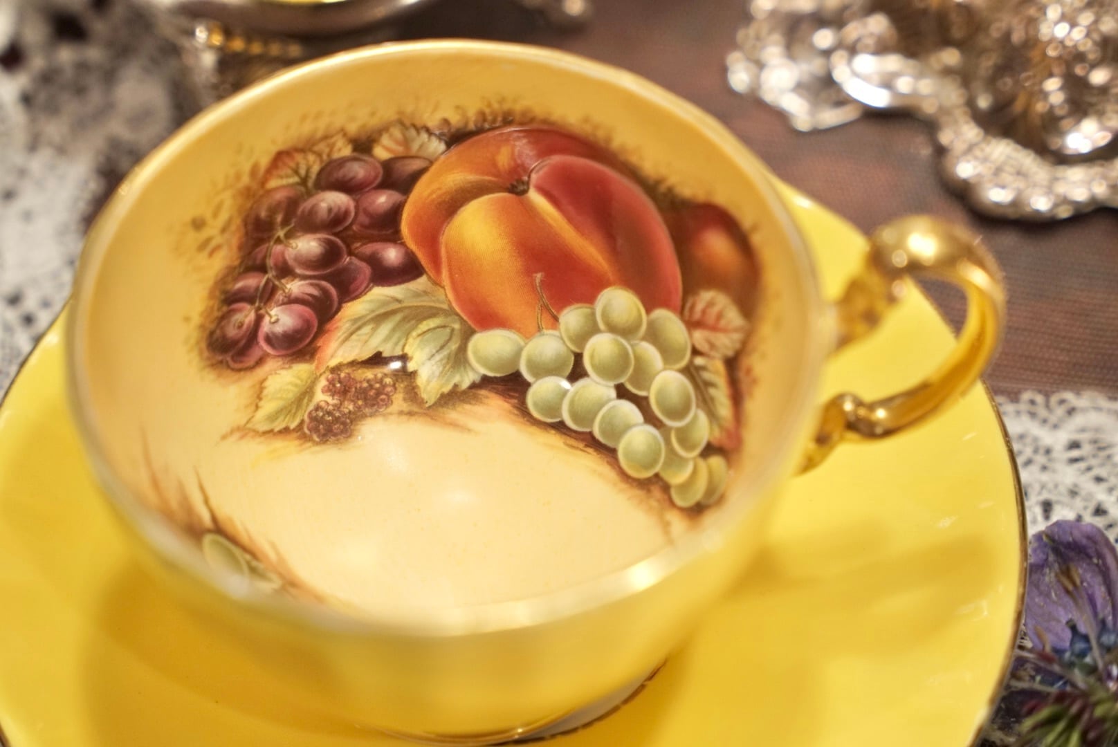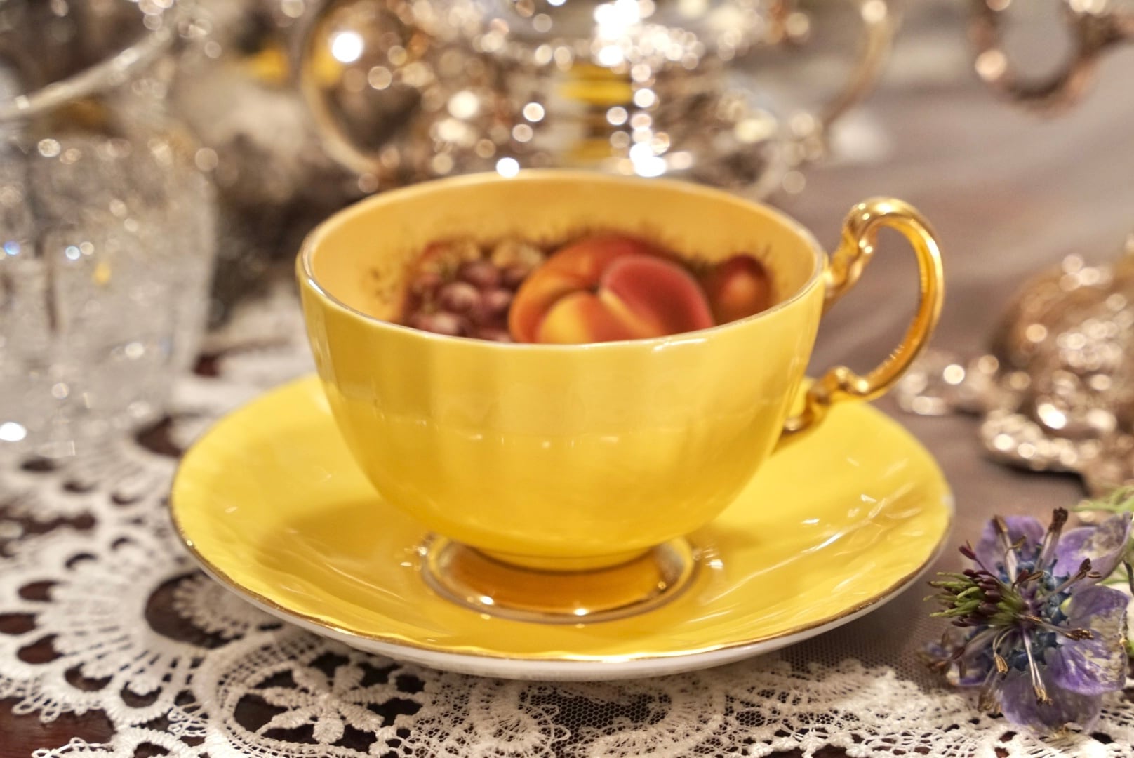 まばゆい黄色の外側と、カップの内側に広がる桃・スグリ・木の実の絵付けが鮮やかなコントラストを生み出し、紅茶を注ぐたびに果樹園の豊かさをそのまま手のひらに感じるような一客です。