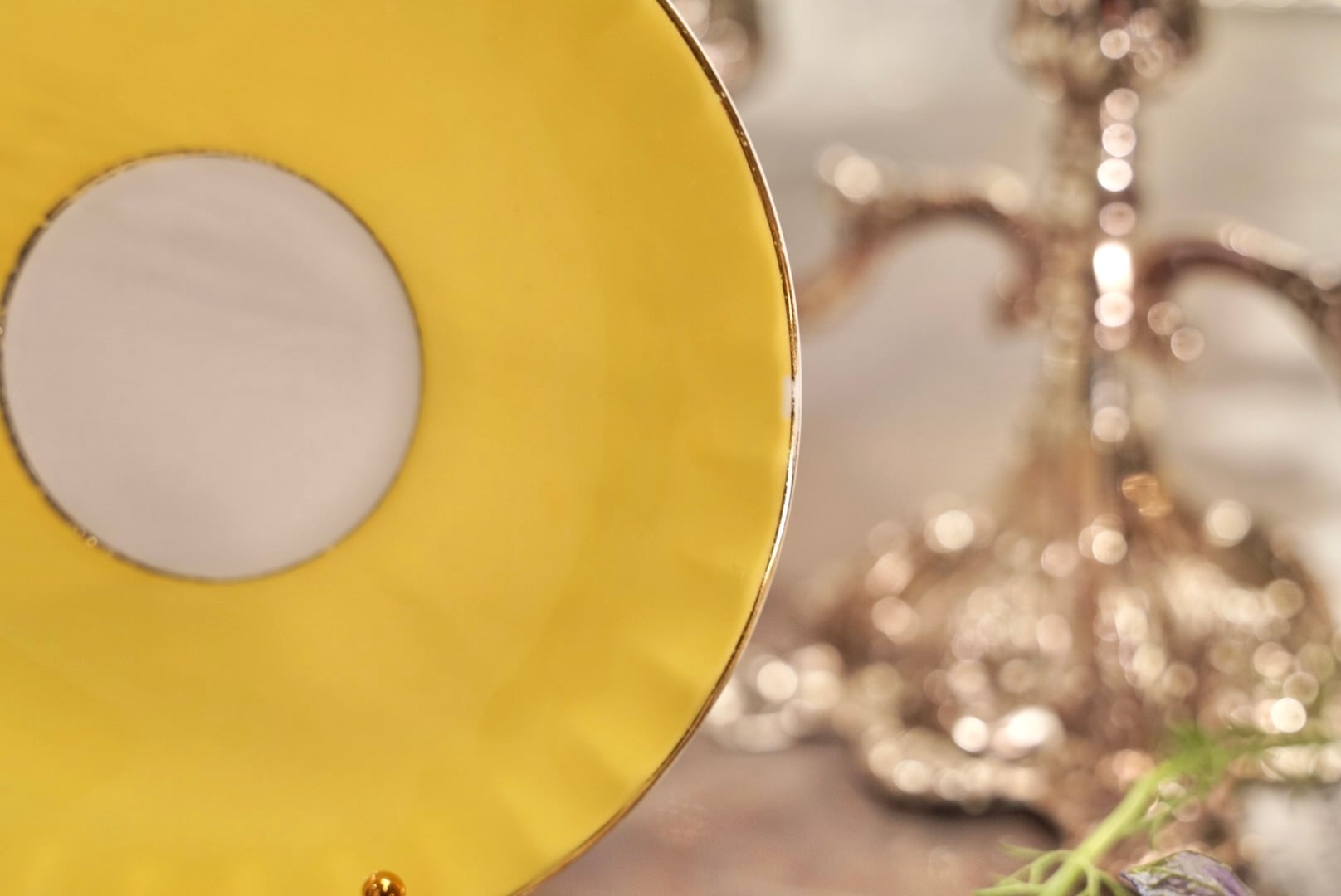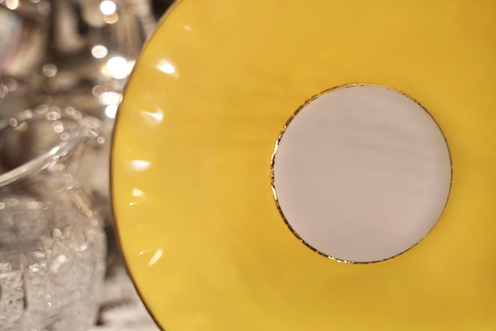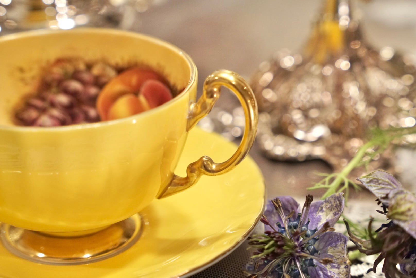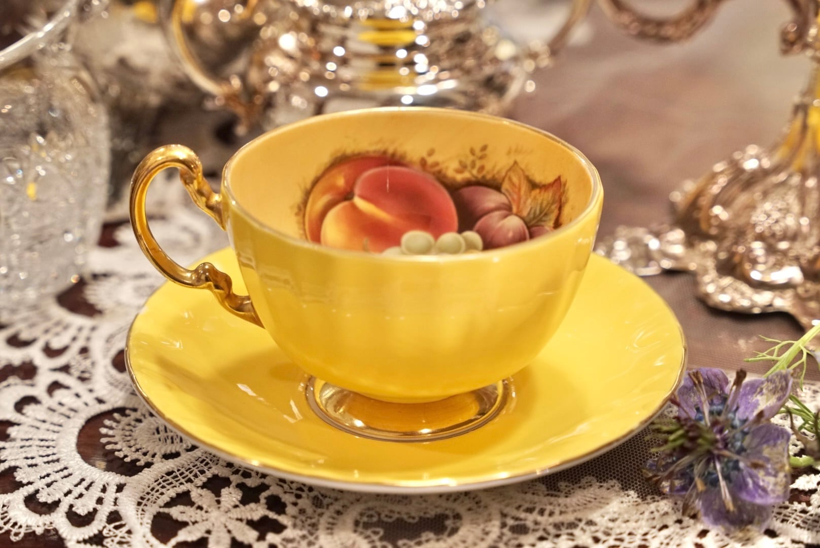 まばゆい黄色の外側と、カップの内側に広がる桃・スグリ・木の実の絵付けが鮮やかなコントラストを生み出し、紅茶を注ぐたびに果樹園の豊かさをそのまま手のひらに感じるような一客です。