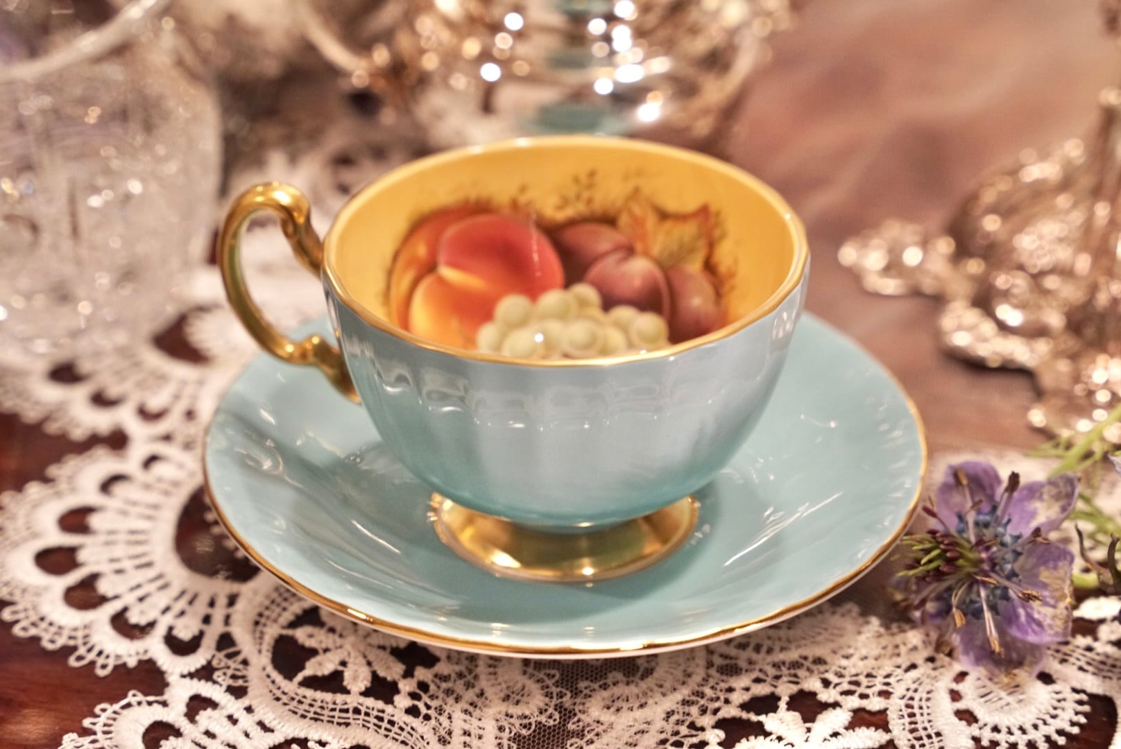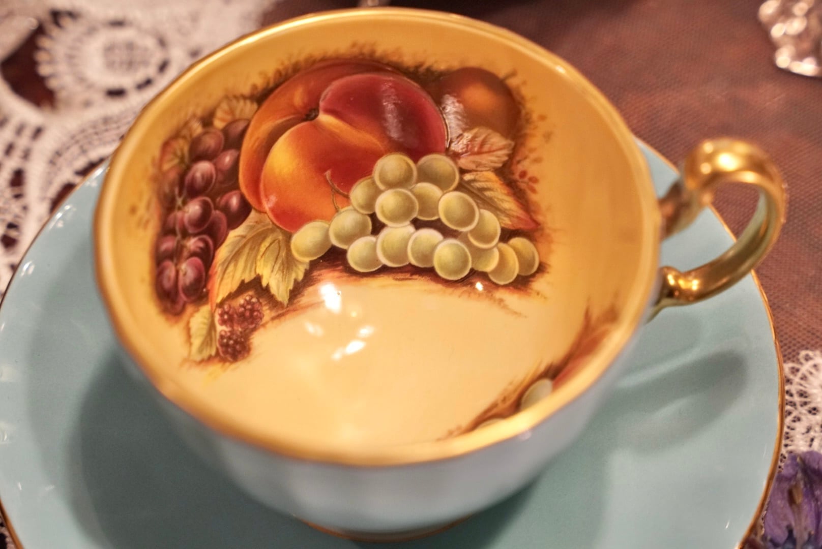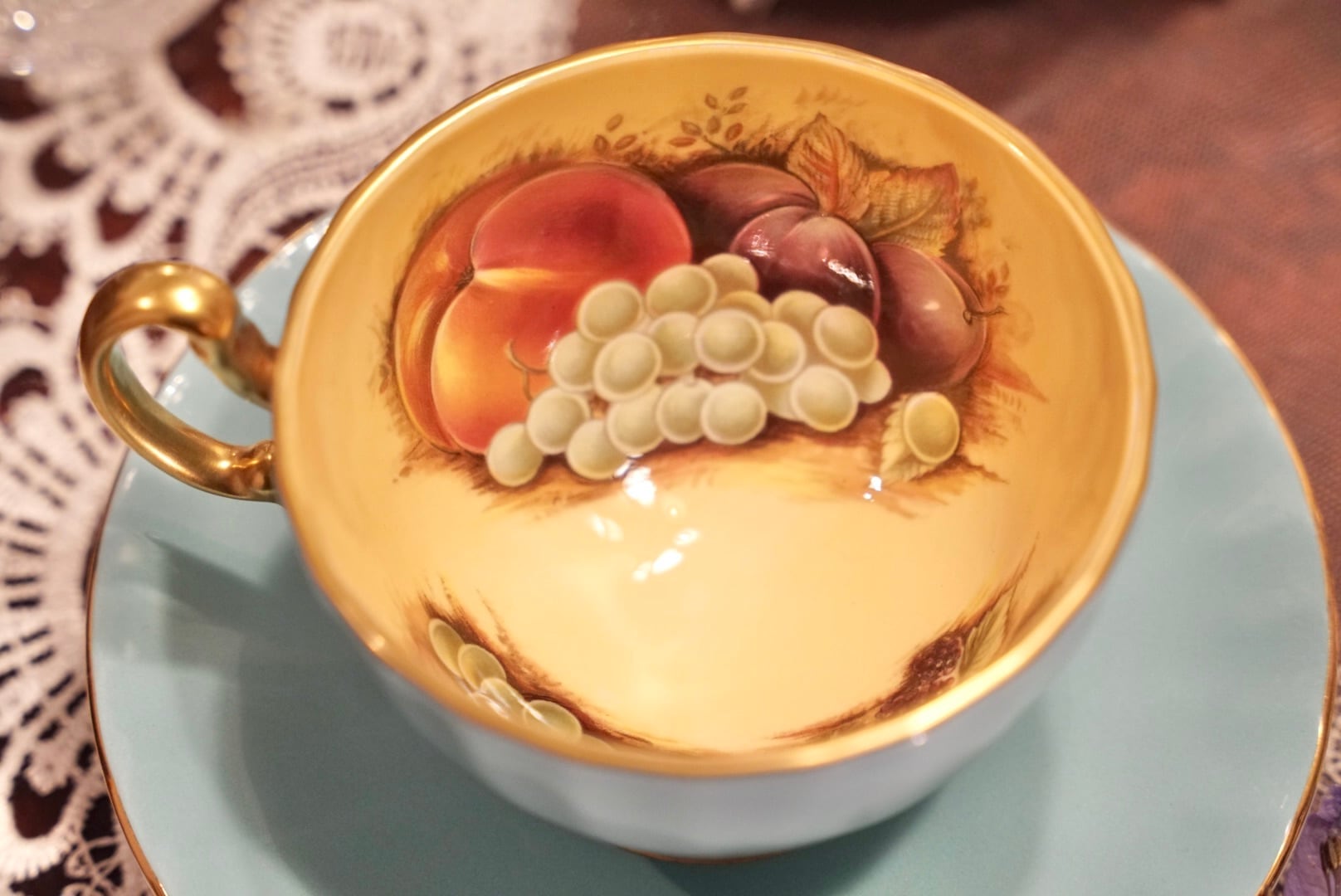 爽やかなターコイズの外側と、カップの内側に広がるゴールドの地色に描かれた桃・ぶどう・洋梨の果実絵付けが、上品で温かみあるコントラストを生み出しています。