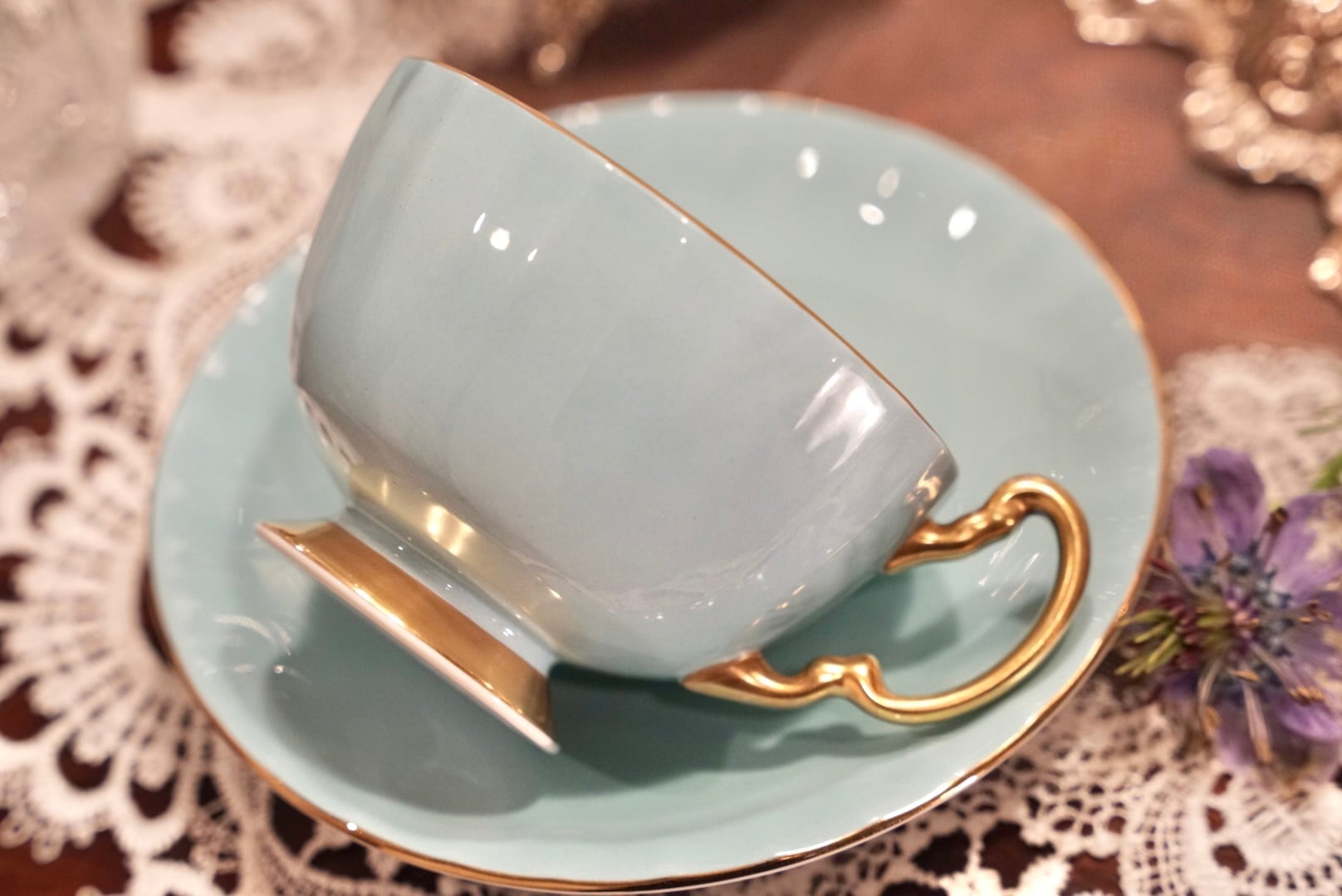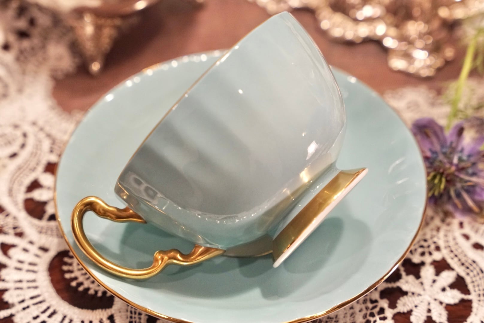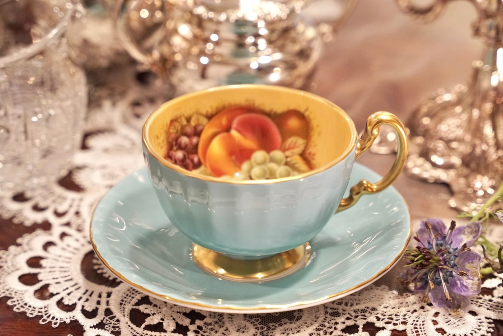 爽やかなターコイズの外側と、カップの内側に広がるゴールドの地色に描かれた桃・ぶどう・洋梨の果実絵付けが、上品で温かみあるコントラストを生み出しています。