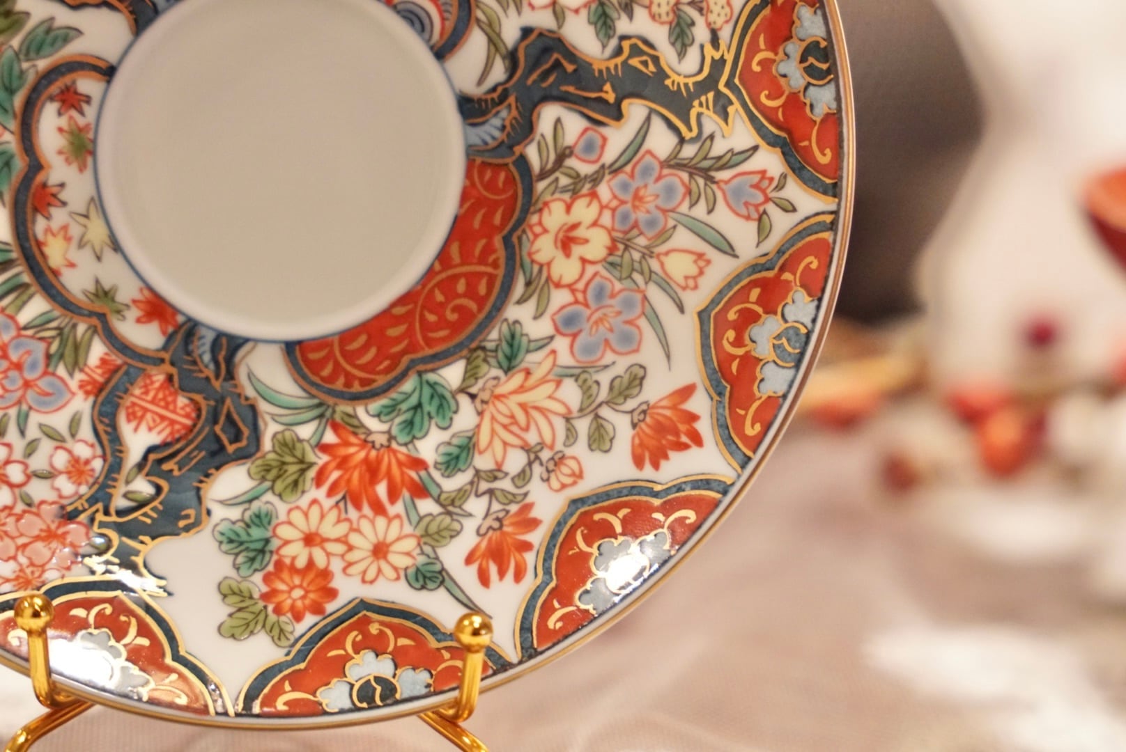 赤・緑・青・金を贅沢に用いた伊万里様式の絵付けが、器の全面を埋め尽くすように広がっています。
