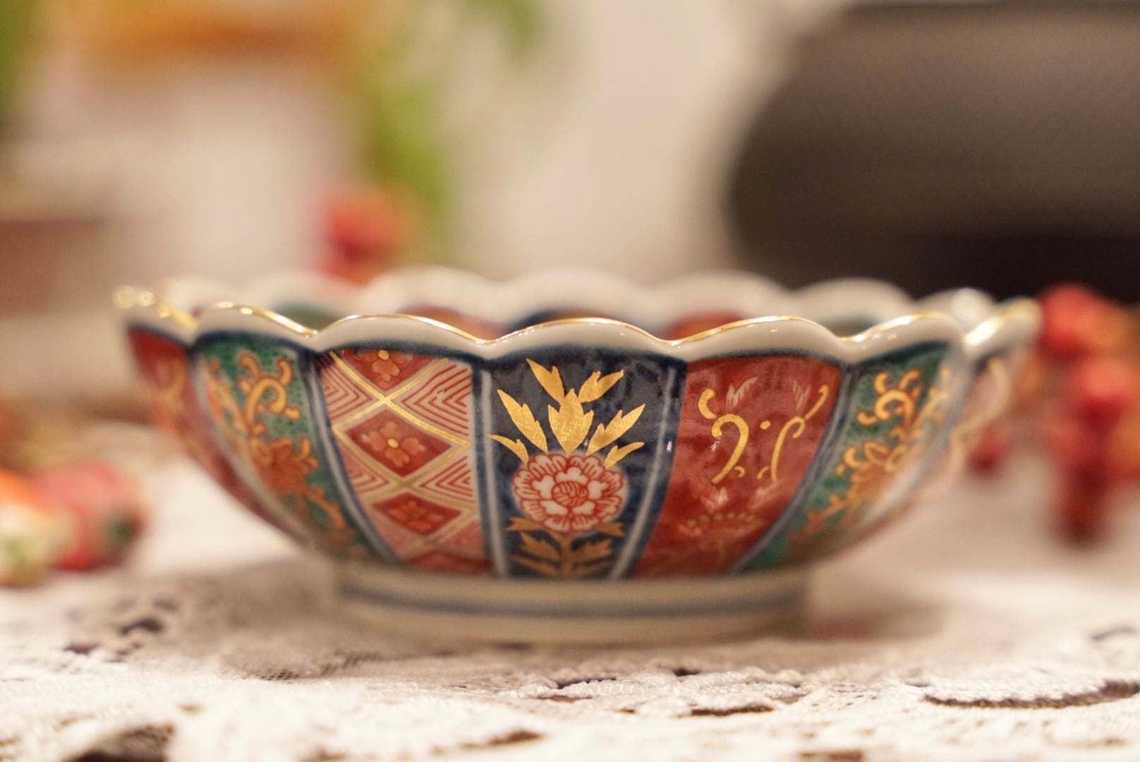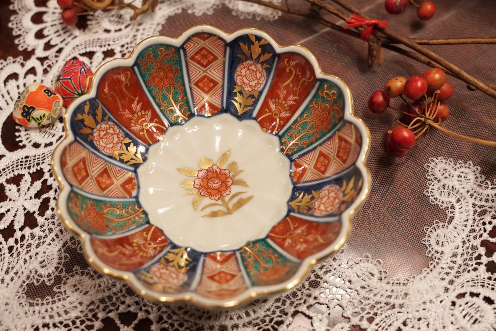 放射状に広がる割菊文の区画には、赤・紺・緑・金を巧みに組み合わせた格子文・花唐草・牡丹文がひとつひとつ丁寧に描き込まれ、中央の白い円文には金彩の牡丹が凛と咲いています。