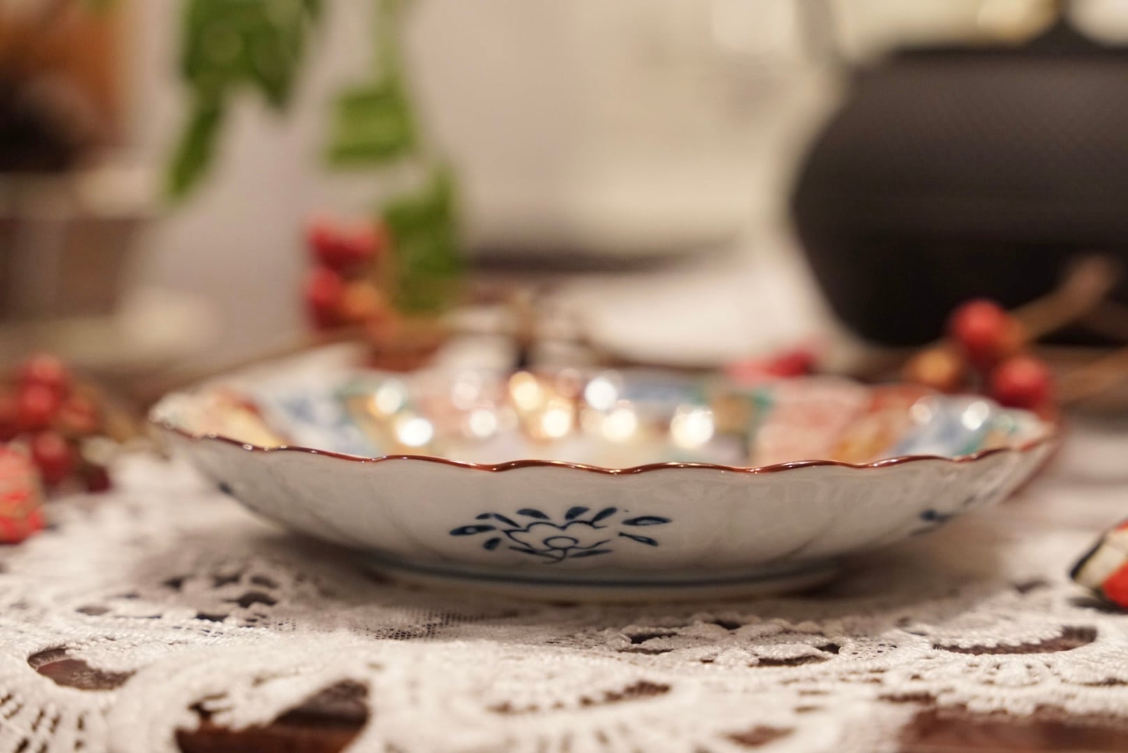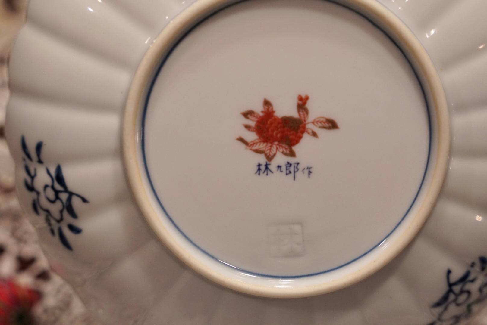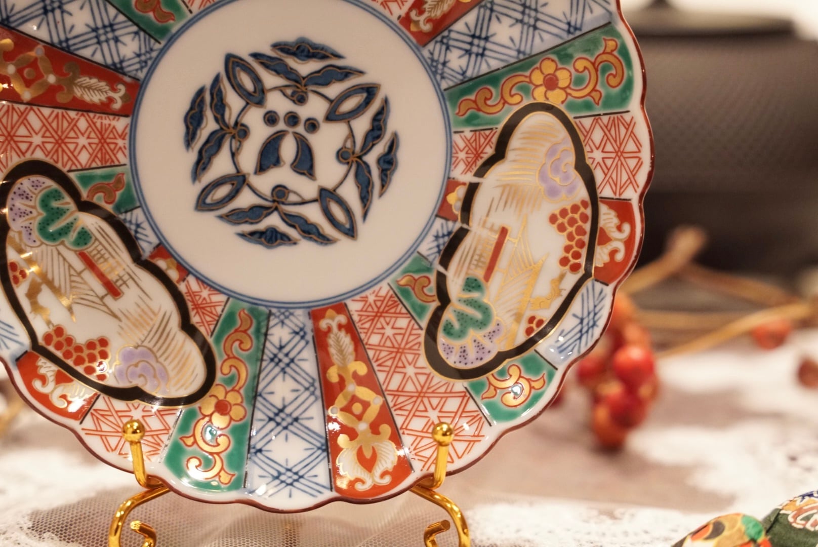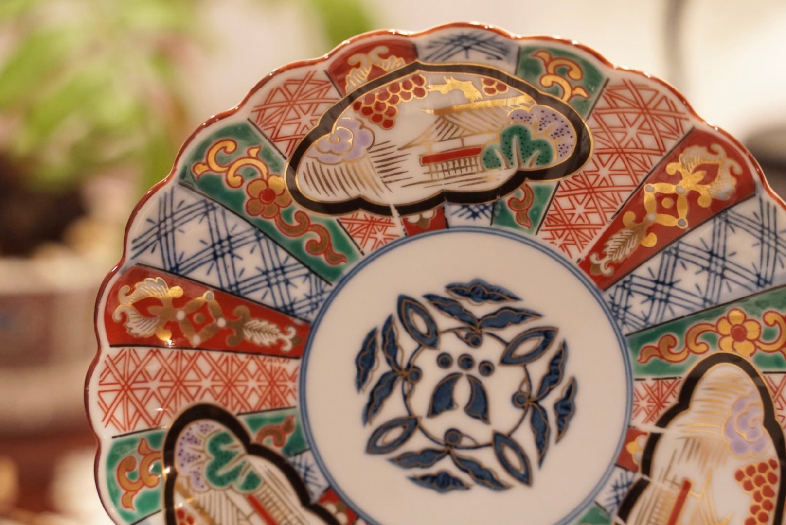 菊花形のスカラップ縁に、伊万里様式の精緻な絵付けが放射状に広がる構図は共通しながら、こちらは中央に染付の葉文・花文をすっきりと配し、周囲の区画には山水楼閣文・格子文・唐草文を赤・緑・藍・金で丁寧に描き込んだ、また異なる表情を持つ一枚です。