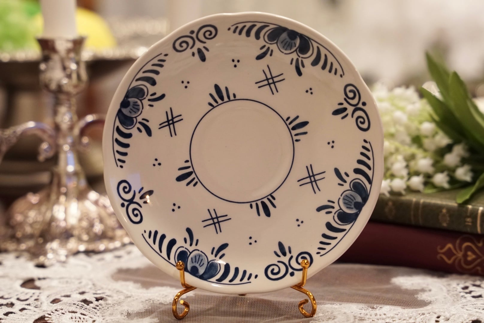 白い器地にのびやかに咲く大輪のバラと草花は、職人がひとつひとつ筆で描いたもの。高台裏に刻まれた絵付け師のサインがその証です。デルフトブルーならではの、深みのある藍色と柔らかなアイボリー地の組み合わせは、どんなテーブルにも静かに、しかし確かな存在感で馴染みます。